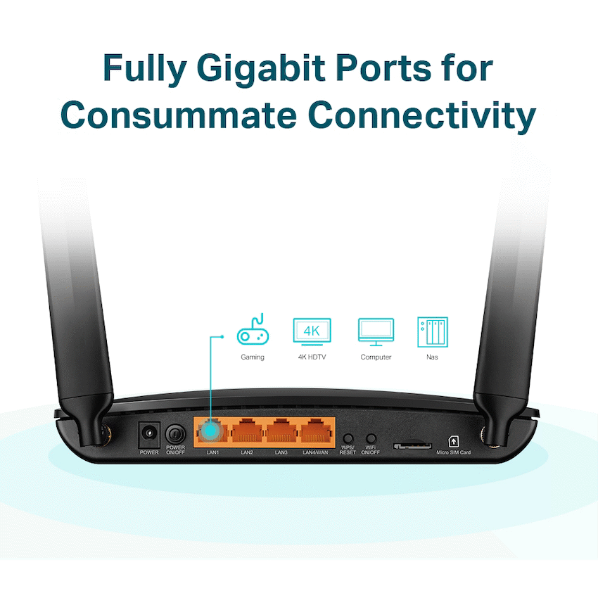 The TP-Link Archer MR600 AC1200 4G LTE Cat6 Gigabit Router is a powerful and flexible networking solution designed to deliver high-speed internet access wherever you need it – even in areas without fixed-line broadband. Combining 4G+ LTE Cat6 mobile connectivity with dual-band Wi-Fi and Gigabit Ethernet, this router is perfect for homes, remote offices, holiday homes, or mobile setups that demand reliable, high-performance internet.With support for 4G+ LTE Cat6, the Archer MR600 can deliver download speeds of up to 300 Mbps and upload speeds of up to 50 Mbps, allowing users to stream 4K content, play online games, and conduct video calls with ease. Simply insert a SIM card, and the router instantly creates a high-speed wireless network – no complex configuration or waiting for installation.The router offers dual-band Wi-Fi with combined speeds of up to 1200 Mbps – 867 Mbps on the 5 GHz band and 300 Mbps on the 2.4 GHz band. This enables smooth multitasking across devices, with the 5 GHz band ideal for bandwidth-intensive activities like streaming and gaming, while the 2.4 GHz band handles everyday tasks like browsing and emailing.