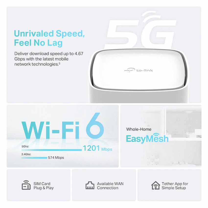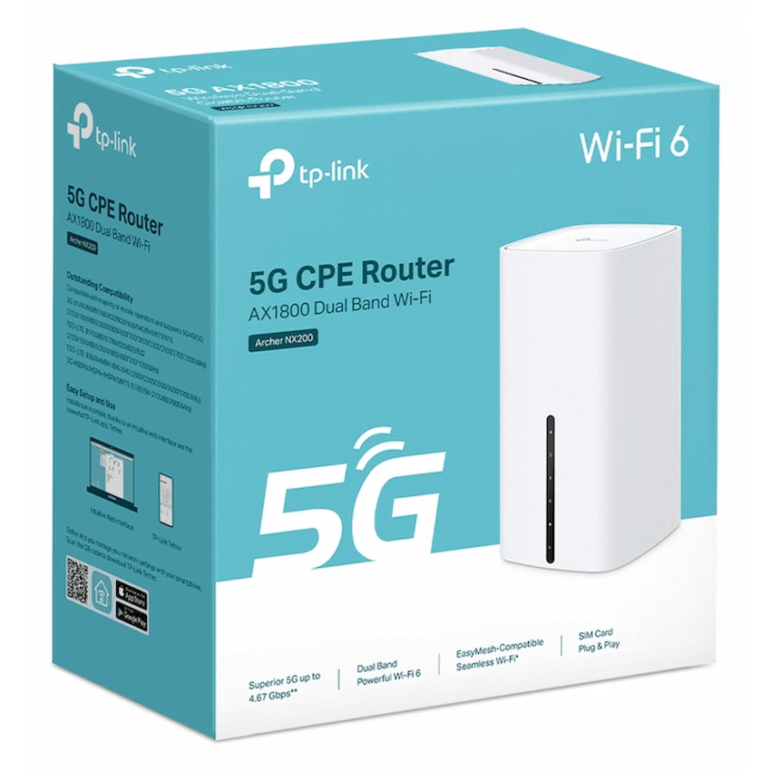 The TP-Link Archer NX200 5G AX1800 Wireless Dual-Band Gigabit Router is a next-generation networking solution that brings the power of 5G mobile connectivity and Wi-Fi 6 (802.11ax) technology into one sleek, high-performance device. Designed for homes, small businesses, and mobile setups, this router delivers ultra-fast internet speeds, low latency, and robust coverage – even in areas without traditional broadband infrastructure.With support for 5G NR (New Radio), the Archer NX200 can achieve mobile download speeds far beyond 4G LTE, making it ideal for streaming 4K/8K content, online gaming, video conferencing, and cloud-based work. Simply insert a nano SIM card, and the router instantly creates a high-speed wireless network – no fiber, DSL, or complicated installation required.The router offers dual-band Wi-Fi 6 with combined wireless speeds of up to 1800 Mbps – 1201 Mbps on the 5 GHz band and 574 Mbps on the 2.4 GHz band. This ensures smooth multitasking across devices, with the 5 GHz band handling bandwidth-intensive tasks and the 2.4 GHz band supporting everyday activities like browsing and smart home connectivity. Wi-Fi 6 also introduces OFDMA and MU-MIMO technologies, which allow simultaneous data transmission to multiple devices, improving overall network efficiency and reducing congestion.