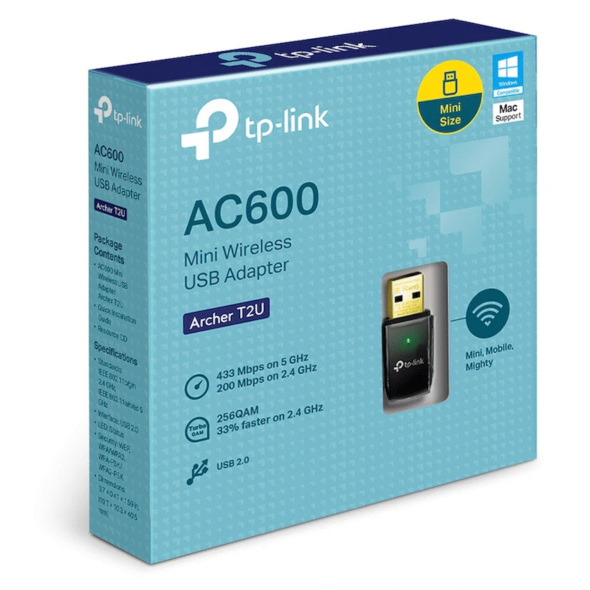The TP-Link Archer T2U AC600 USB Adapter upgrades your laptop or desktop with reliable dual-band Wi-Fi, offering speeds of up to 600Mbps-200Mbps on 2.4GHz and 433Mbps on 5GHz. This makes it ideal for everyday browsing, HD streaming, and smooth online gaming.Its compact and portable design allows you to plug it into any USB port without blocking nearby connections, while advanced 802.11ac Wi-Fi technology ensures faster, more efficient wireless performance. With support for WPA/WPA2 encryption, it keeps your network secure.Compatible with Windows and macOS, the Archer T2U is a quick, hassle-free solution to upgrade your device to high-speed Wi-Fi.