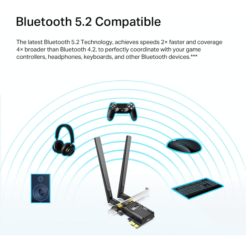 The TP-Link Archer TX20E AX1800 Wi-Fi 6 Bluetooth 5.2 PCIe Adapter is a cutting-edge upgrade for desktop PCs, delivering ultra-fast wireless connectivity and seamless Bluetooth pairing in one sleek, high-performance package. Designed for users who demand speed, stability, and future-ready technology, this adapter brings the power of Wi-Fi 6 (802.11ax) and Bluetooth 5.2 directly to your system via a PCIe slot.With dual-band Wi-Fi 6, the Archer TX20E offers combined wireless speeds of up to 1800 Mbps – 1201 Mbps on the 5 GHz band and 574 Mbps on the 2.4 GHz band. Wi-Fi 6 introduces advanced features like OFDMA and MU-MIMO, which allow simultaneous data transmission to multiple devices, reduce latency, and improve overall network efficiency – perfect for 4K streaming, online gaming, and heavy multitasking.The adapter also features Bluetooth 5.2, offering faster data rates, broader range, and lower power consumption compared to previous versions. This enables smooth, stable connections to Bluetooth peripherals such as headphones, game controllers, keyboards, and smart devices – with improved audio quality and reduced interference.