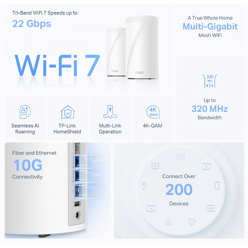 TP-Link Deco BE85(1-Pack) BE19000 Tri-Band Whole Home Mesh WiFi 7 System12-Stream 19 Gbps Tri-Band WiFi – 11520 Mbps (6 GHz) + 5760 Mbps (5 GHz) + 1376 Mbps (2.4 GHz).Unprecedented 10 Gbps Network – 1x 10 Gbps Ethernet/Fiber Combo WAN/LAN port + 1x 10 Gbps WAN/LAN port + 2x 2.5 Gbps ports ensure max flexibility and boosted throughput.Wireless and Wired Combined Backhaul – Connects a wireless and wired backhaul with each unit simultaneously to improve overall throughput and reduce latency.Multi-Link Operation (MLO) – Simultaneously send and receive data across different bands and channels to increase throughput, reduce latency, and improve reliability.320 MHz Channels – Double the bandwidth and enables many more simultaneous transmissions at the fastest possible speeds.Works on the 6 GHz Band – Minimizes congestion with greenfield spectrum, delivering robust high-speed connections.TP-Link HomeShield – Provides comprehensive network protection, robust parental controls, and real-time IoT security.Universal Compatibility – Backward compatible with all WiFi generations and works with any internet service provider (ISP) and modem.