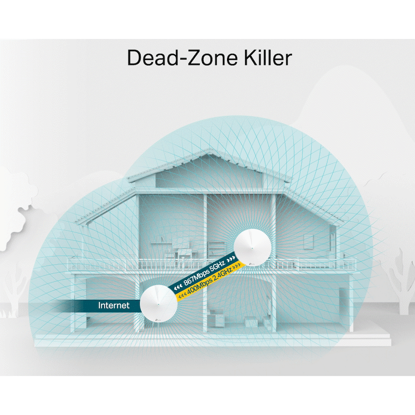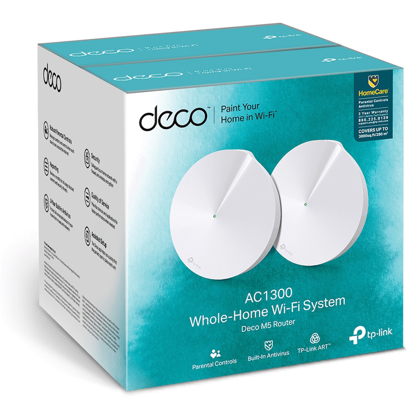 TP-Link Deco M5(2-Pack) AC1300 Whole-Home Mesh Wi-Fi SystemDeco uses a system of units to achieve seamless whole-home Wi-Fi coverage – eliminate weak signal areas once and for all!With advanced Deco Mesh Technology, units work together to form one unified whole-home network with the same network name. Devices automatically switch between Decos as you move through your home for the fastest possible speeds.A Deco M5 two-pack delivers Wi-Fi to an area of up to 3,800 square feet. And if that’s not enough, simply add more Decos to the network anytime to increase coverage.Deco M5 provides fast and stable connections with speeds of up to 1267 Mbps and works with major internet service provider (ISP) and modem.Deco can handle traffic from even the busiest of networks, providing lag-free connections for over 100 devices.TP-Link HomeCareTM provides a suite of personalized and secure features, including Parental Controls, built-in Antivirus and Quality of Service (QoS).Setup is easier than ever with the Deco app there to walk you through every step.