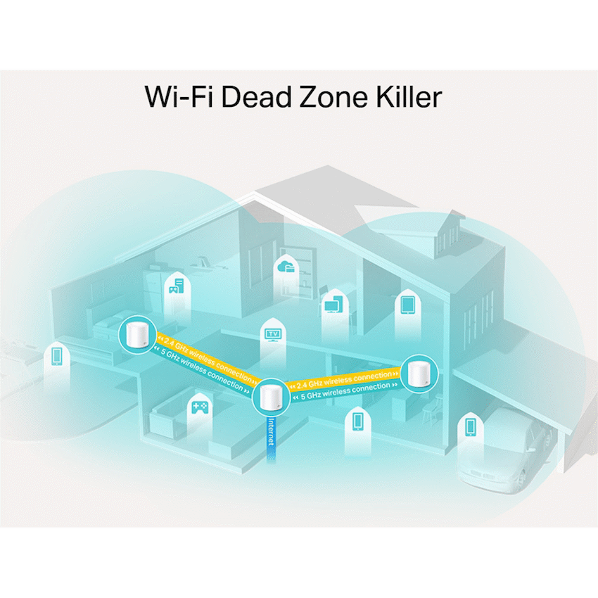 TP-Link Deco X20(3-Pack) AX1800 Whole-Home Mesh Wi-Fi 6 SystemFaster Connections: Wi-Fi 6 speeds up to 1,800 Mbps-1,201 Mbps on 5 GHz and 574 Mbps on 2.4 GHz.Connect More Devices: OFDMA and MU-MIMO technology quadruple capacity to enable simultaneous transmission to more devices.Boosted Seamless Coverage: Achieve seamless whole home coverage with a clearer and stronger whole home Wi-Fi signal generated by Wi-Fi 6.Ultra-Low Latency: Greater reduction in latency enables more responsive gaming and video chatting.One Unified Network: Multiple units form a whole-home network that auto-selects the best connection as you move around your home.Total Security: WPA3 encryption and TP-Link HomeCareTM provide personalized features, including Parental Controls, Antivirus, and Quality of Service (QoS) to ensure a safer online experience.Setup Made Easier Than Ever: The Deco app walks you through setup step-by-step.