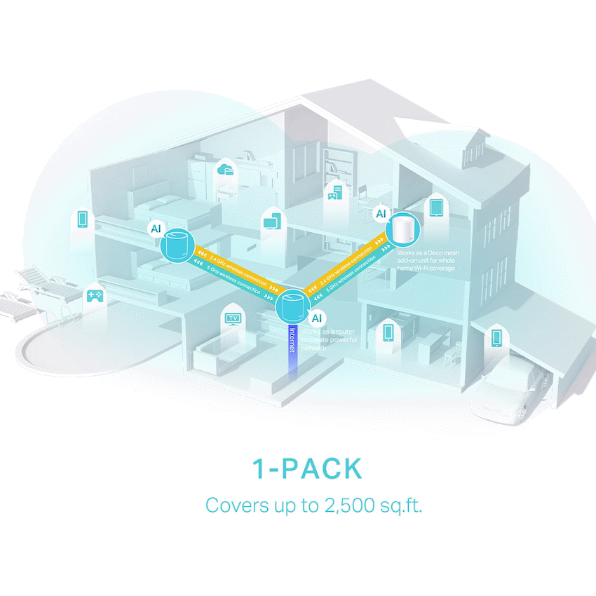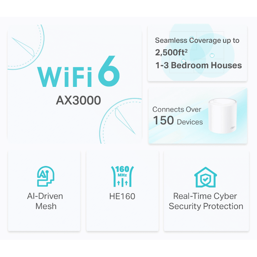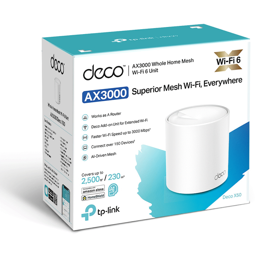 TP-Link Deco X50(1-Pack) AX3000 Whole Home Mesh Wi-Fi 6 SystemDual Band WiFi 6: Deliver speeds up to 3.0 Gbps – 2402 Mbps on 5 GHz and 574 Mbps on 2.4 GHz.+Gigabit Wired Speed: Support lightning fast Wi-Fi 6 speeds with (1) x Gigabit WAN/LAN port uplink and connect multiple devices with (2) x Gigabit LAN ports for ultimate connectivity.Boosted Seamless Coverage – Seamless mesh WiFi coverage up to 2,500 ft2 with one Deco unit.AI-Driven Mesh – Intelligently learns the network environment to provide ideal WiFi unique to your home.TP-Link HomeShield – Provides comprehensive network protection, robust parental controls, and real-time IoT protection.*Setup Made Easier Than Ever – The Deco app walks you through the setup step-by-step.