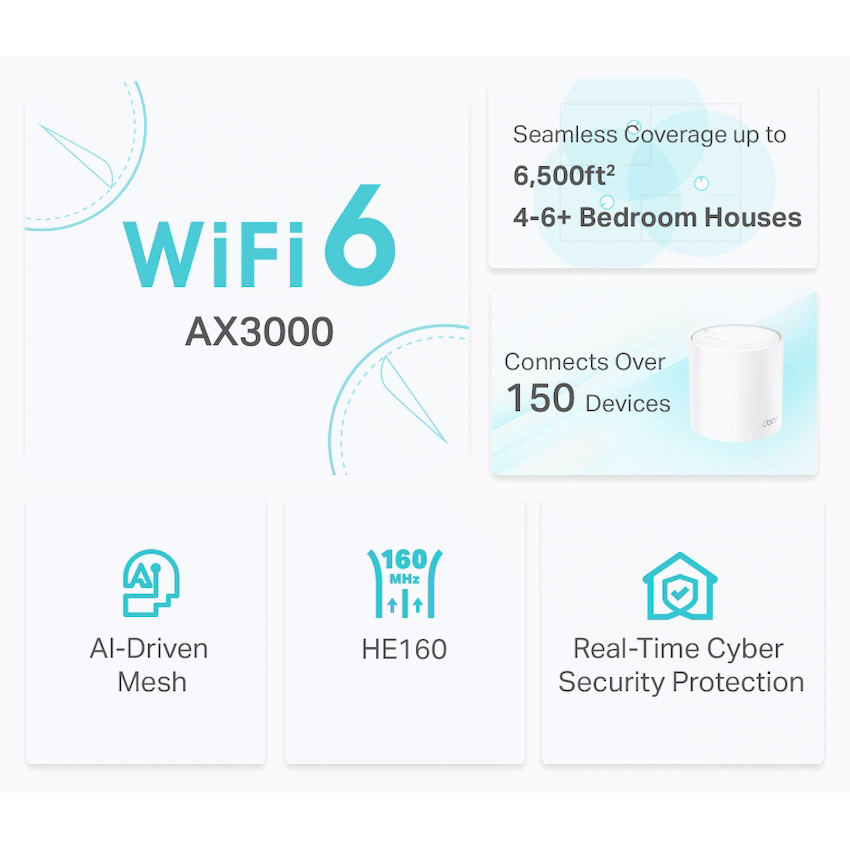 TP-Link Deco X50(2-Pack) AX3000 Whole Home Mesh Wi-Fi 6 SystemAX3000 Dual Band WiFi – Super-fast WiFi 6 with speeds up to 3.0 Gbps4 Streams, Less Lag – 2×2/HE160 2402 Mbps + 2×2 574 MbpsGigabit Wired Speed – 3x Gigabit ports provide sufficient connectivityBoosted Seamless Coverage – Seamless mesh WiFi coverage up to 6,500 ft2 (3-pack)AI-Driven Mesh – Intelligently learns the network environment to provide ideal WiFi unique to your homeTP-Link HomeShield – Provides comprehensive network protection, robust parental controls, and real-time IoT protectionSetup Made Easier Than Ever – The Deco app walks you through the setup step-by-step