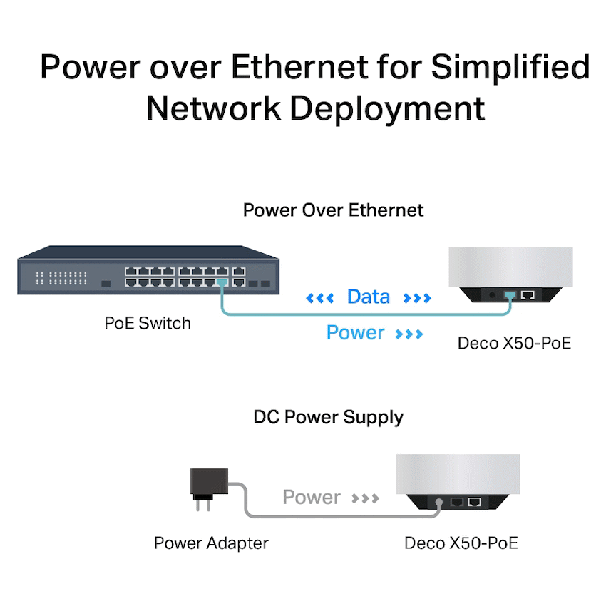 TP-Link Deco X50-POE(1-Pack) AX3000 Whole Home Mesh Wi-Fi 6 System with PoEAX3000 Dual-Band WiFi – 2402 Mbps (5 GHz) + 574 Mbps (2.4 GHz).+Multiple Installation Options – Place it on a tabletop or install it on a ceiling or wall with the adaptive accessories.PoE Supported – Power over Ethernet for simplified network deployment.Multi-Gig 2.5 Gbps Wired Network – 2x 2.5 Gbps ports.SSeamless AI-Driven Mesh – Intelligently learns your network environment to provide the ideal WiFi unique to your home.++TP-Link HomeShield – Provides comprehensive network protection, robust parental controls, and real-time IoT security.*Universal Compatibility – Backward compatible with all WiFi generations and works with any internet service provider (ISP) and modem.?Setup Made Easier Than Ever – The Deco app walks you through setup step-by-step.
