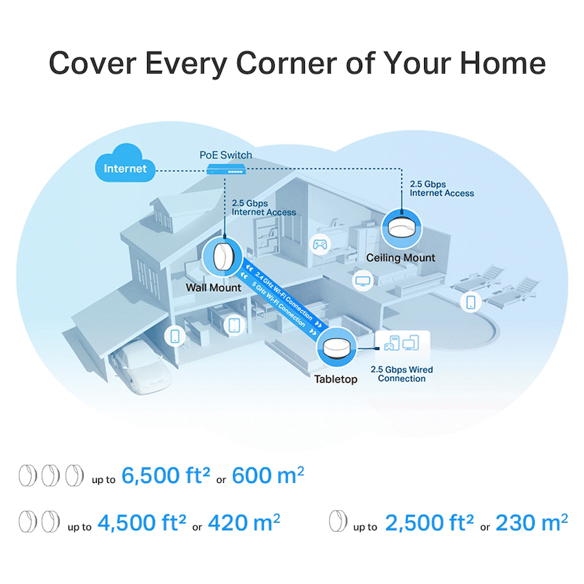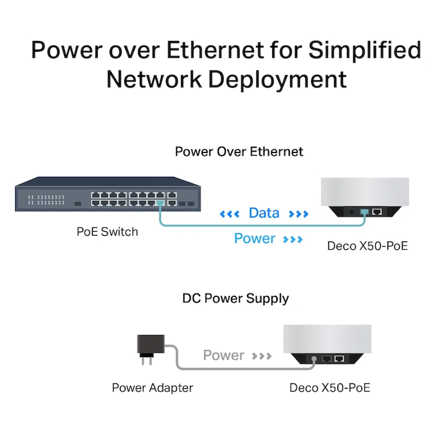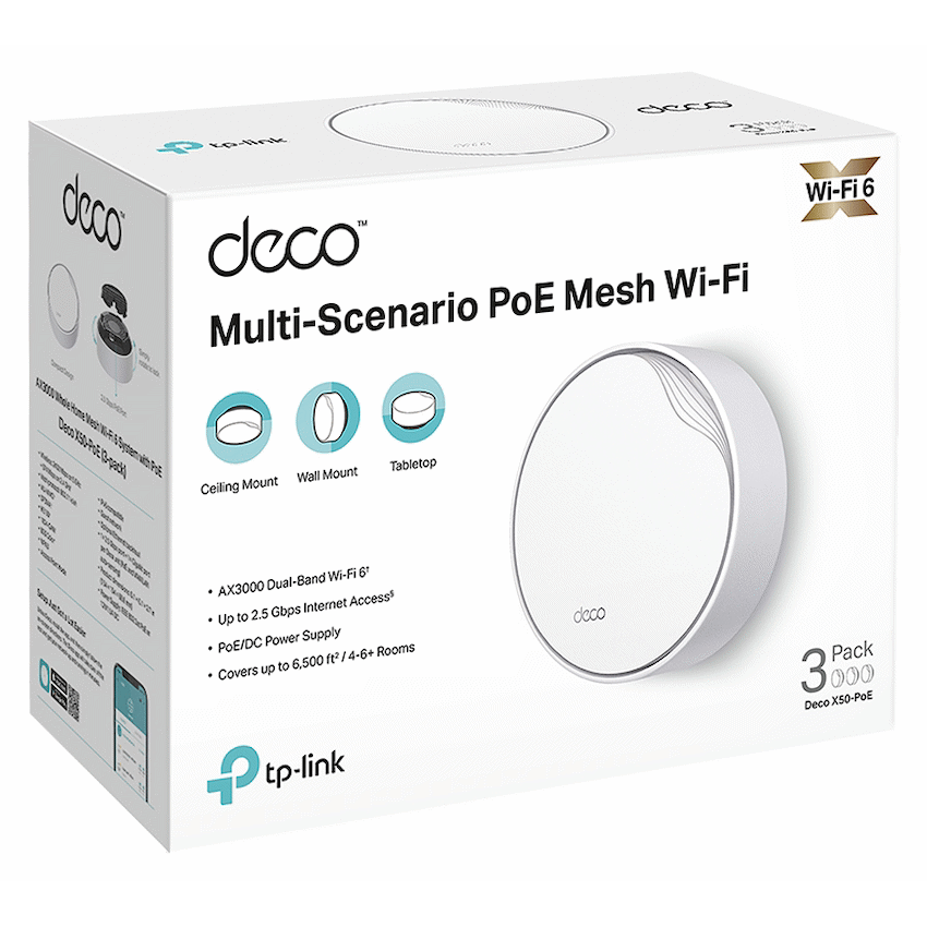 TP-Link Deco X50-PoE(2-Pack) AX3000 Whole Home Mesh Wi-Fi 6 System with PoEAX3000 Dual-Band WiFi – 2402 Mbps (5 GHz) + 574 Mbps (2.4 GHz).+Multiple Installation Options – Place it on a tabletop or install it on a ceiling or wall with the adaptive accessories.PoE Supported – Power over Ethernet for simplified network deployment.Multi-Gig 2.5 Gbps Wired Network – 1x 2.5 Gbps port + 1x Gigabit Port.SSeamless AI-Driven Mesh – Intelligently learns your network environment to provide the ideal WiFi unique to your home.++TP-Link HomeShield – Provides comprehensive network protection, robust parental controls, and real-time IoT security.*Universal Compatibility – Backward compatible with all WiFi generations and works with any internet service provider (ISP) and modem.Setup Made Easier Than Ever – The Deco app walks you through setup step-by-step.