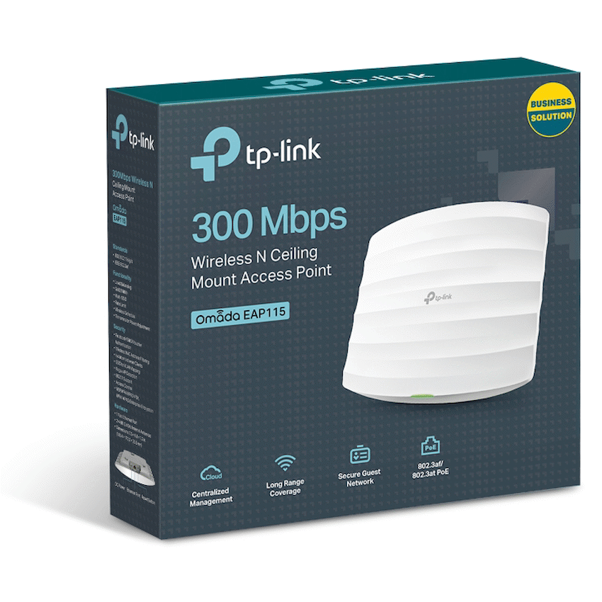 TP-Link EAP115 300Mbps Wireless N Wall-Plate Access PointFree cloud centralized management and Omada app for ultra convenience and easy managementSupports Power over Ethernet (802.3af) for convenient and affordable installationSimple mounting design for easy attachment to a wall or ceilingSecure guest network along with multiple authentication options (SMS/Facebook Wi-Fi/ Voucher, etc.) and abundant wireless security technologiesEnterprise class Wi-Fi security help to decrease network security threatsMulti-SSID divides multiple wireless networks for different user typesSupports management vlan for an enhanced network management