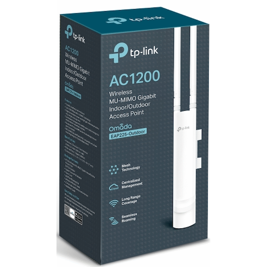 The TP-Link EAP225-Outdoor AC1200 Dual Band Access Point is a high-performance, weatherproof wireless solution designed to extend fast and reliable Wi-Fi coverage to outdoor environments. Whether you’re deploying connectivity across campuses, resorts, parks, or open-air venues, this access point delivers enterprise-grade performance with the flexibility and durability needed for outdoor use.Built on the 802.11ac Wave 2 Wi-Fi standard, the EAP225-Outdoor offers dual-band speeds up to 1200 Mbps – 867 Mbps on the 5 GHz band and 300 Mbps on the 2.4 GHz band. This ensures smooth 4K streaming, low-latency gaming, and fast browsing, even in high-density environments with many connected devices.Equipped with two detachable high-gain omnidirectional antennas, the EAP225-Outdoor provides wide-area coverage and strong signal penetration. Its IP65-rated weatherproof enclosure protects against dust, rain, and extreme temperatures, while 6kV lightning protection and 15kV ESD protection ensure reliable operation in harsh outdoor conditions.As part of TP-Link’s Omada SDN (Software Defined Networking) platform, the EAP225-Outdoor supports centralized cloud-based management through the Omada Controller or Omada Cloud, allowing network administrators to configure, monitor, and optimize multiple access points from a single interface.