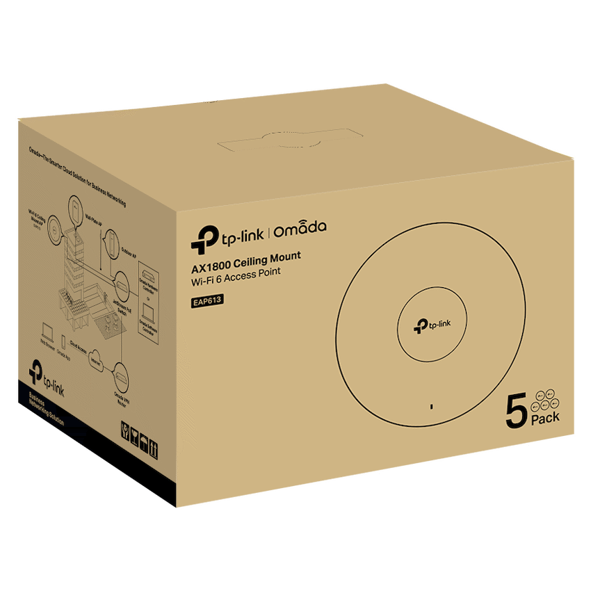 TP-Link EAP613 AX1800 Ceiling Mount Wi-Fi 6 Access PointUltra-Fast WiFi 6 Speeds: Simultaneous 574 Mbps on 2.4 GHz and 1201 Mbps on 5 GHz totals 1775 Mbps Wi-Fi speeds.High-Efficiency WiFi 6: More connected devices can enjoy faster speeds.Centralized Cloud Management: Manage the whole network locally or from the cloud via web UI or Omada app.Seamless Roaming: Even video streams and voice calls are unaffected as users move between locations.SOmada Mesh: Enables wireless connectivity between access points for extended range and flexible deployment.PoE+ Powered: Supports DC (adapter is not included), 802.3at PoE+, and Passive PoE for flexible installations.Ultra-Slim Design: ?160 mm x 33.6 mm elegant design brings more agility.Secure Guest Network: Along with multiple authentication options (SMS/Voucher, etc.) and abundant wireless security technologies.