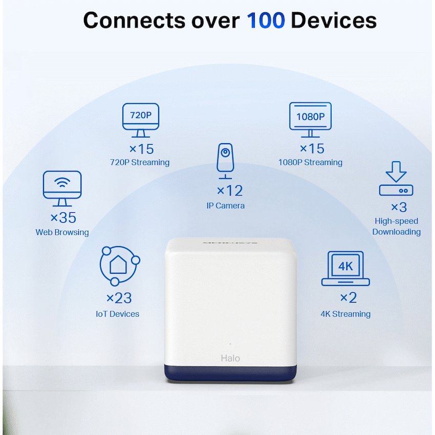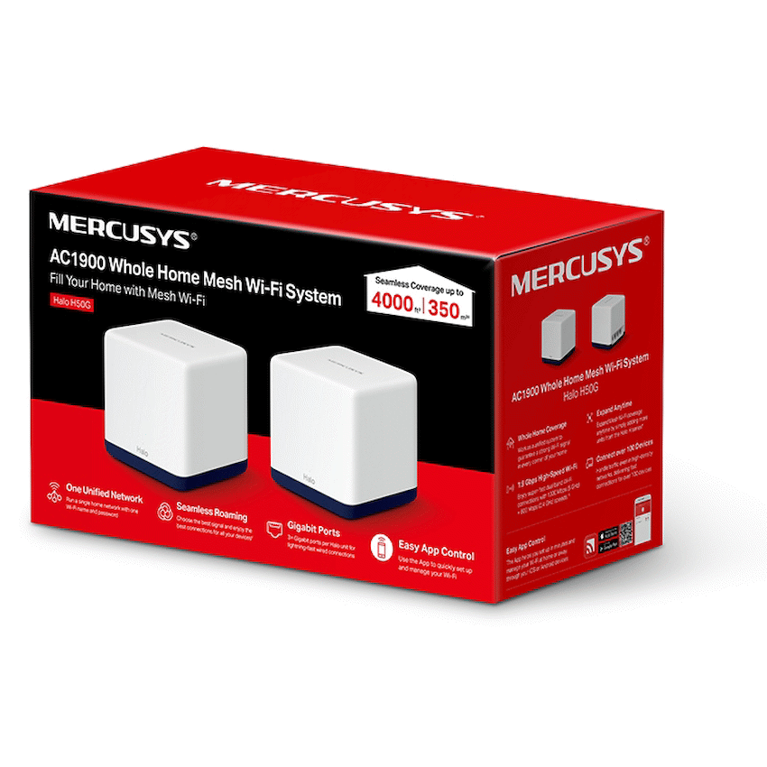 TP-Link Mercusys Halo H50G(2-Pack) AC1900 Whole Home Mesh Wi-Fi SystemOne Unified Network – With advanced Mesh Technology, Halo units work together to form a single unified whole home network with one WiFi name and password.Seamless Roaming – Automatically switch between Halos as you move around your home, always getting the best signal to enjoy the fastest connections for all your devices.Whole Home Coverage – Blanket up to 6,000 ft2 (550 m2) with high-speed WiFi, eliminating WiFi dead zones at your home.1.9 Gbps Dual Band WiFi – Halo H50G provides fast and stable connections for over 100 devices with speeds of up to 1,900 Mbps and works with major internet service providers (ISPs) and modems.Easy App Control – Use the MERCUSYS App to quickly set up and manage your WiFi.Full Gigabit Ports – 3x Gigabit ports per Halo unit for lightning-fast wired connections*Please note that the Halo H series and S series cannot work together.