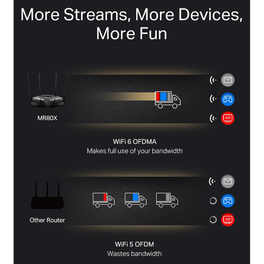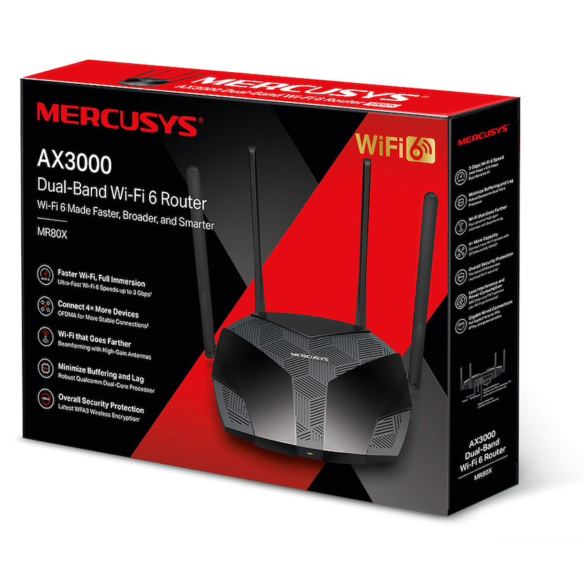 TP-Link Mercusys MR80X AX3000 Dual-Band Wi-Fi 6 Router OPTIMAL WIFI 6 SPEEDS – Optimal WiFi 6 speeds reaching up to 3 Gbps for faster browsing, streamings, and downloading, all at the same time. MORE DEVICES, MORE FUN – Supports MU-MIMO and OFDMA to reduce congestion and quadruple the average throughput. WiFi THAT GOES FARTHER – 4x multi-directional high-gain antennas with Beamforming boost stable connections throughout your home for strong WiFi signals in every corner OVERALL SECURITY PROTECTION – The latest WPA3 provides improved WiFi security GIGABIT WIRED CONNECTIONS – Make full use of your internet access and transfer data at dizzying speeds for peak performance ECO-FRIENDLY POWER SAVING – Target Wake Time (TWT) reduces power consumption for your mobile and IoT devices during data transmissions LESS WIFI INTERFERENCE – Minimizes the interference from neighboring signals to improve transmission efficiency with BSS coloring SMART CONNECT – Intelligently chooses the best available band for each device.