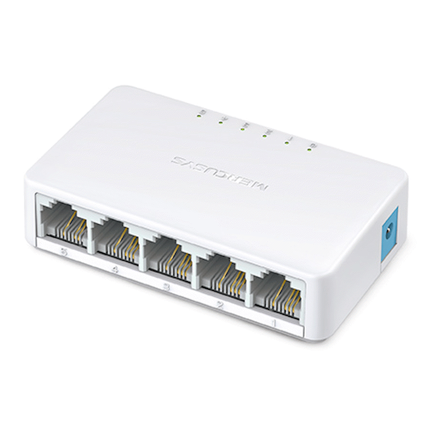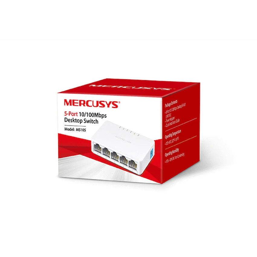 Easily expand your wired network with the Mercusys MS105 5-Port 10/100Mbps Desktop Switch, a simple and reliable solution for homes, small offices, and dorm rooms. With five fast Ethernet ports, the MS105 allows you to connect multiple devices such as PCs, printers, smart TVs, and game consoles to your network, all at the same time.The plug-and-play design means no complicated setup-just connect your devices and enjoy fast, stable wired connections. Its compact size makes it easy to place anywhere, while the fanless design ensures silent operation, perfect for noise-sensitive environments.Whether you’re boosting your home network or adding extra ports to your office setup, the MS105 delivers dependable performance and hassle-free connectivity at an affordable price.
