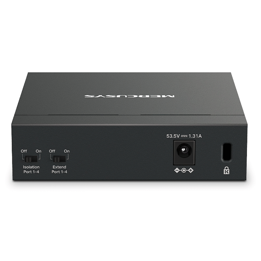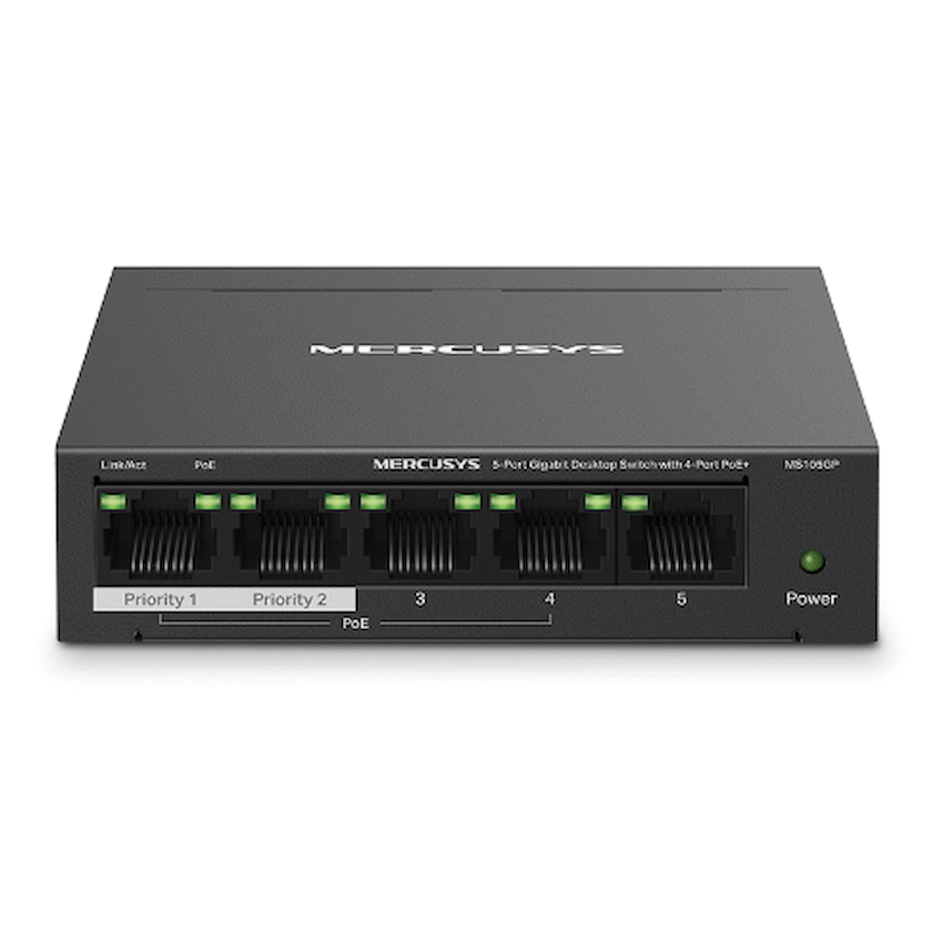 Simplify your network with the Mercusys MS105GP 5-Port Gigabit Desktop Switch with 4-Port PoE+, designed for both high-speed connectivity and power delivery. With five gigabit ports, this switch ensures ultra-fast wired connections, while four PoE+ ports deliver both data and power over a single cable-perfect for powering devices like IP cameras, wireless access points, and VoIP phones without extra adapters.Supporting the 802.3af/at PoE+ standard, the MS105GP offers a total PoE power budget of up to 65W, providing stable and efficient power distribution across multiple devices. The plug-and-play setup makes it easy to expand your home, office, or surveillance network in minutes, with no complex configuration required.Compact, reliable, and energy-efficient, the MS105GP is the smart choice for anyone who needs a cost-effective solution to combine gigabit networking with PoE+ support.