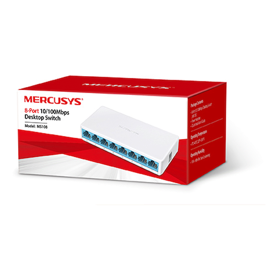 Easily add more devices to your wired network with the Mercusys MS108 8-Port 10/100Mbps Desktop Switch. With eight Fast Ethernet ports, this compact switch is perfect for connecting PCs, printers, smart TVs, game consoles, and other wired devices in your home or small office.The plug-and-play design means setup is effortless-just connect your devices and enjoy stable, reliable wired connections without configuration. Its fanless design ensures completely silent operation, while the slim and compact build makes it easy to place anywhere, even in tight spaces.Whether you need to expand your home network or create additional ports in your office, the MS108 delivers simple, dependable, and energy-efficient performance at an affordable price.