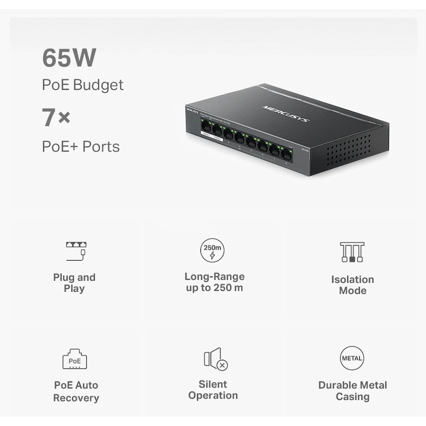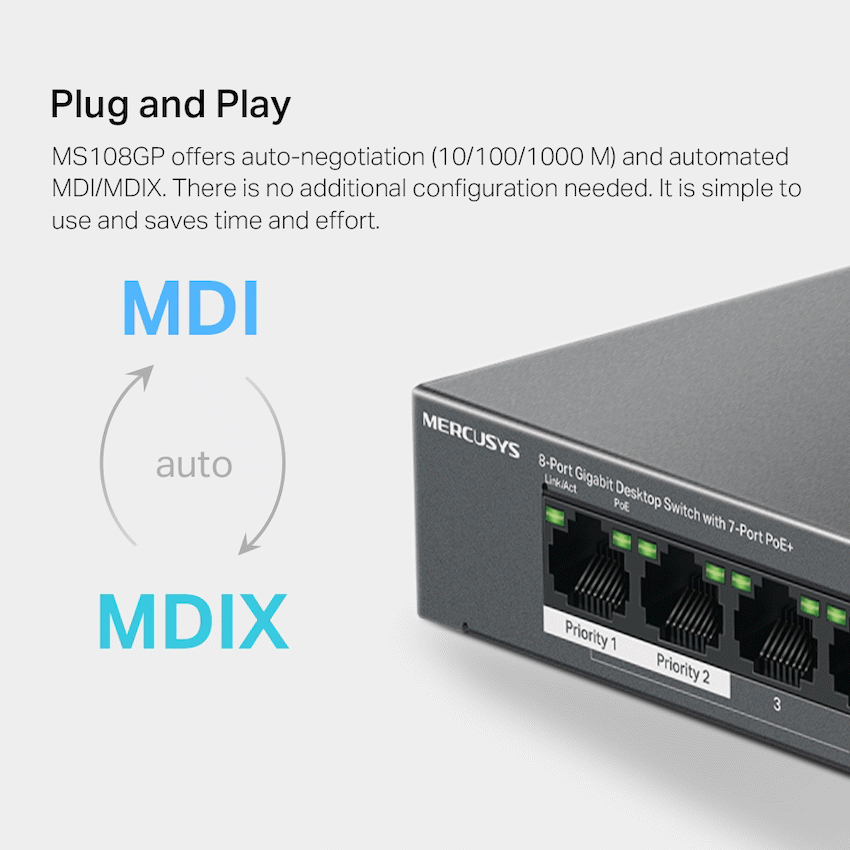Simplify and expand your network with the Mercusys MS108GP 8-Port Gigabit Desktop Switch with 7-Port PoE+. Offering eight gigabit ports, this switch delivers blazing-fast wired connections for smooth 4K streaming, gaming, and large file transfers. Out of the eight ports, seven support PoE+, enabling both data and power delivery over a single cable-ideal for powering IP cameras, wireless access points, VoIP phones, and other PoE devices without the need for extra power adapters.With support for the 802.3af/at PoE+ standard, the MS108GP provides a total PoE power budget of up to 65W, making it reliable for multi-device setups. Its plug-and-play design means setup is effortless-no technical configuration required. Compact and silent with a fanless design, this switch blends seamlessly into homes, offices, and small business environments.Whether you’re building a surveillance system, extending your office network, or setting up smart devices at home, the MS108GP delivers fast, stable, and power-efficient connectivity.