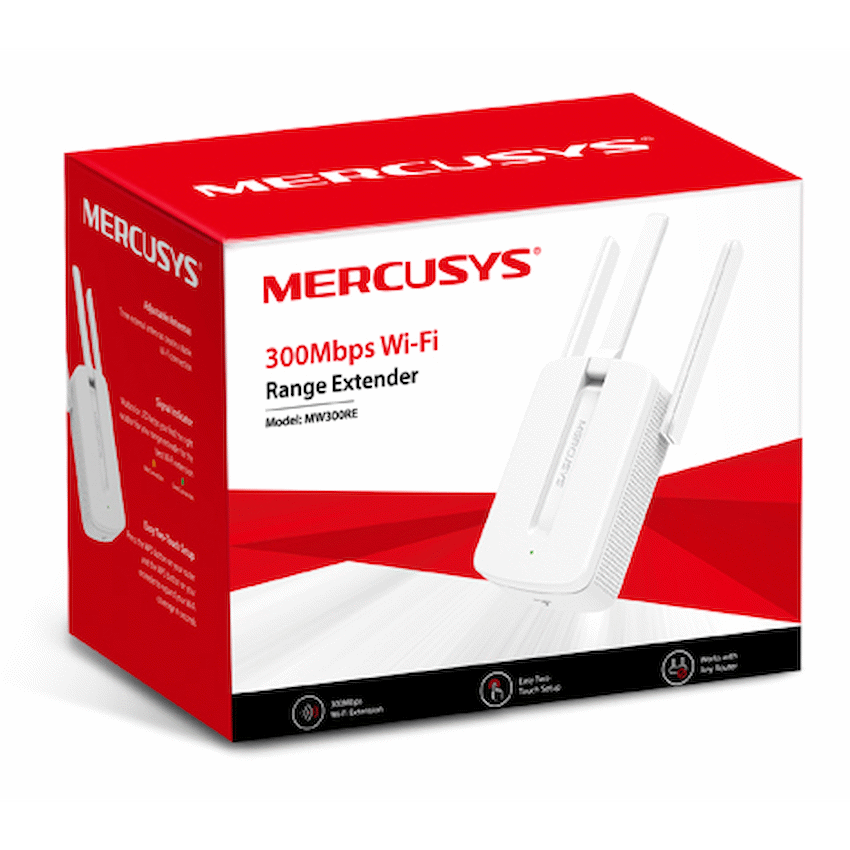 Get rid of weak signals and Wi-Fi dead zones with the Mercusys MW300RE 300Mbps Wi-Fi Range Extender. Designed to work seamlessly with your existing router, this extender improves coverage by repeating and strengthening the wireless signal throughout your home or office.With speeds of up to 300Mbps, the MW300RE is perfect for everyday online activities such as browsing, streaming, emailing, and video calls. Its three adjustable antennas help optimise coverage and maintain stable connections across multiple devices.Setup is simple-just press the WPS button to connect instantly to your router, and use the smart signal indicator to find the best placement for maximum coverage. Its compact wall-plug design makes it easy to install without taking up extra space.Ideal for homes, apartments, or small offices, the MW300RE ensures you stay connected wherever you need Wi-Fi.