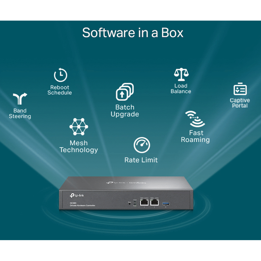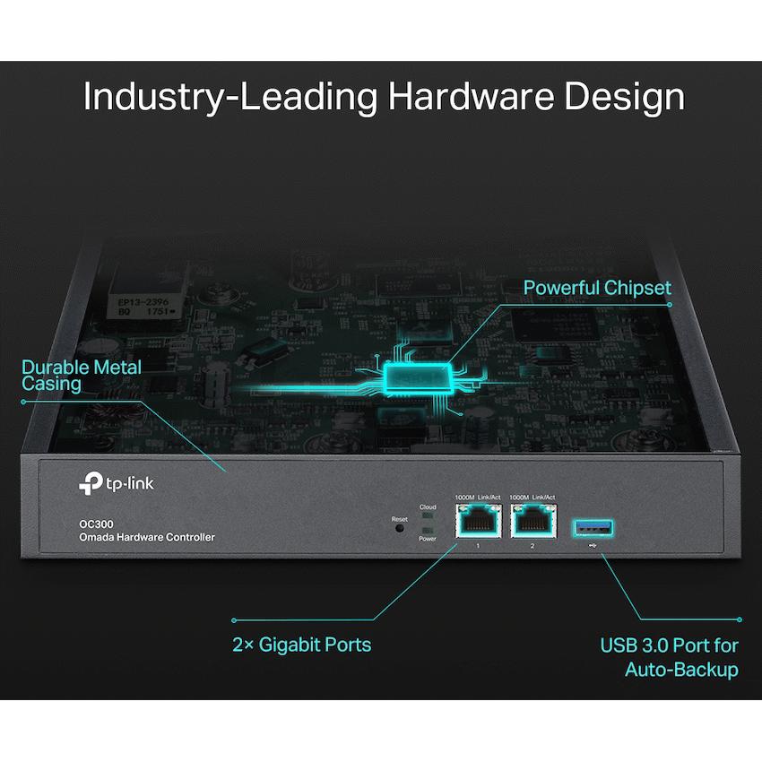 TP-Link Omada OC300 Omada Hardware ControllerCentralized management for up to 500 Omada access points, JetStream switches, and SafeStream routers.Cloud access to manage from anywhere, anytime.Locally monitor and manage devices with the ultimate security and stability.The Omada app for convenient management.Industry-leading hardware design with a powerful chipset, durable metal casing, and USB 3.0 port for auto backup.Batch management, multi-site management, and remote firmware updates benefit network maintenance.The easy-to-use dashboard makes it easy to see your real-time network status and check network usage and traffic distribution.Network topology helps IT admins quickly see and troubleshoot connections at a glance.