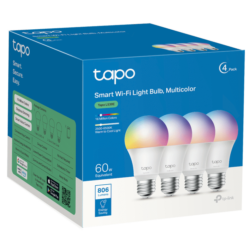 TP-Link Tapo L530E(4-Pack) Smart Wi-Fi Light Bulb, MulticolorMulticolor – Easily design scenarios for your daily routine or activities by customizing brightness, light temperature, and colors-with 16,000,000 hues to choose from.60-watt equivalent – LED bulb produces up to 806 lumens of white brightness and has a dimming range from 1% to 100%.Preset for Convenience – Found your favorite lighting for watching movies? Save it as a setting you can simply select for future movie nights.Schedule & Timer – Create schedules and count plans to turn on/off with the brightness/color you set.Sunrise and Sunset Modes – Automatically activate your light according to your time zone.No Hub Required – Connect the L530E light to your home wifi, then you are all set.Voice Control – Manage the lights with your voice commands as Tapo works with Amazon Alexa and Google Assistant.Remote Control – Take your phone out of your pocket and open the Tapo app to control your light remotely.Away Mode – Automatically simulate someone being at home to frighten away, unwanted visitors.Restore Last Light State – the bulb automatically returns to its previous power-off state.