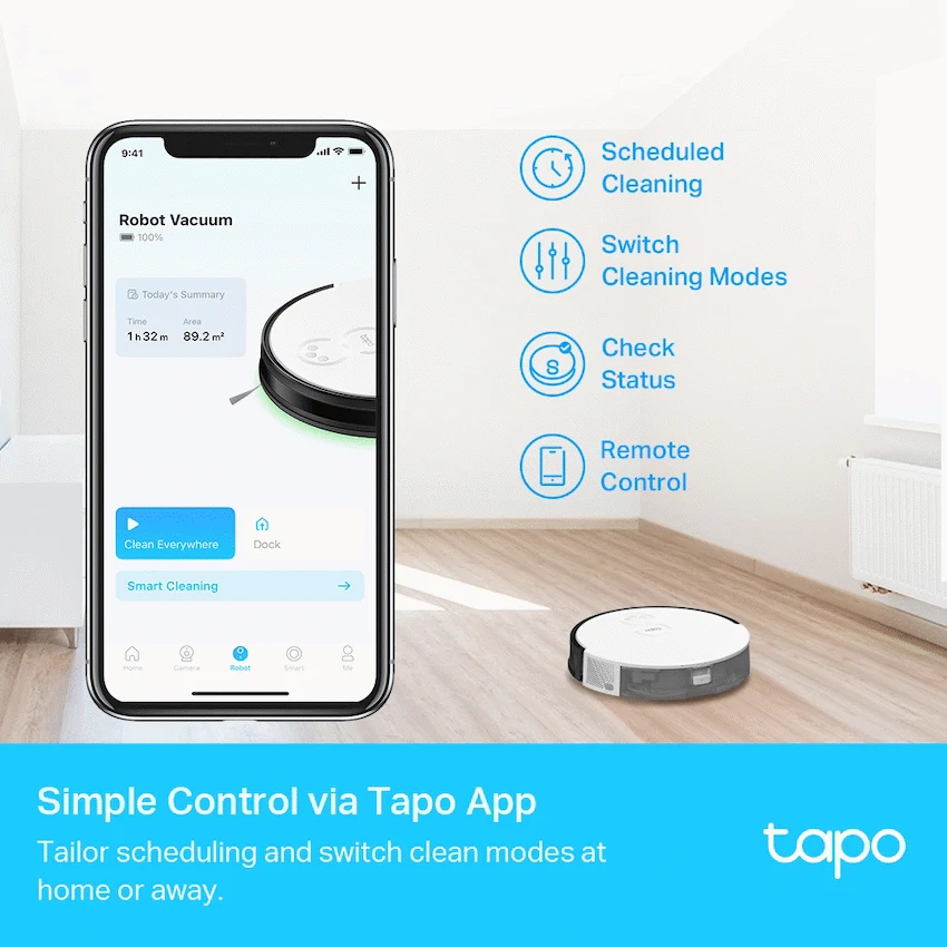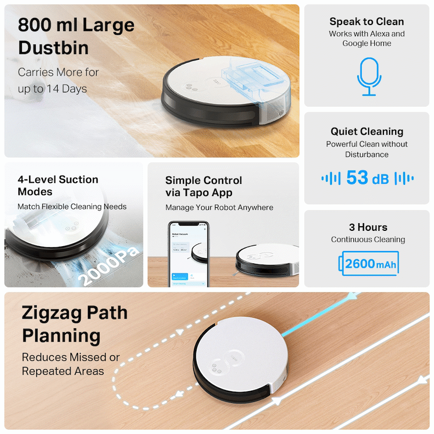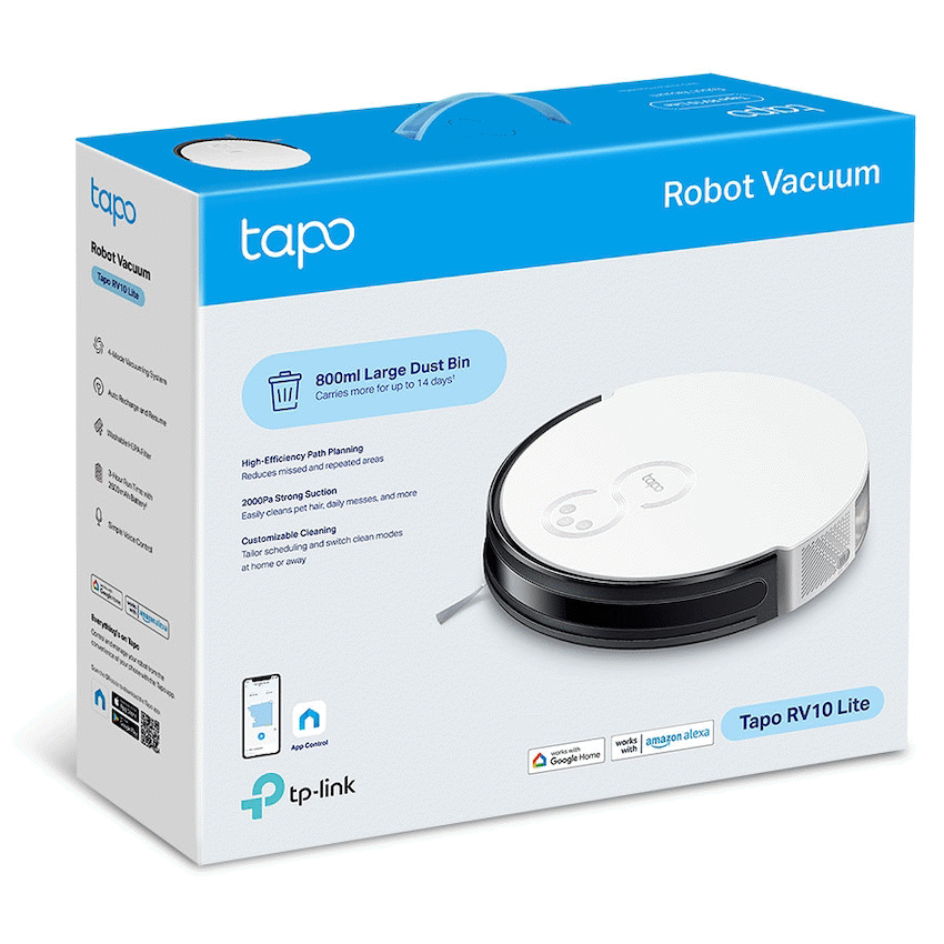 TP-Link Tapo RV10 Lite – Robot Vacuum Cleaner, Gyroscope, 2600 mAh800ml Extra Large Dustbin – Holds even more debris, pet hair, and dust for up to 14 days.1High-Efficiency Zigzag Path Planning – Organizes a neat zigzag route to reduce missed or repeated areas compared with random-path robot vacuums.4-Level Suction Modes – 2000Pa Strong Suction. Easily clean pet hair, daily messes, and more.Simple Control via Tapo App – Tailor scheduling and switch clean modes at home or away.3-Hour Continuous Cleaning – 2600mAh long-lasting battery to clean your whole home on a single charge.2Auto-Charging – Returns to the charging dock automatically when the battery gets low, and then restarts right where it left off.Carpet Auto-Boost – Increases the suction power when moving from a hard floor to a carpet.Voice Control – Simply send voice commands via smart speakers.