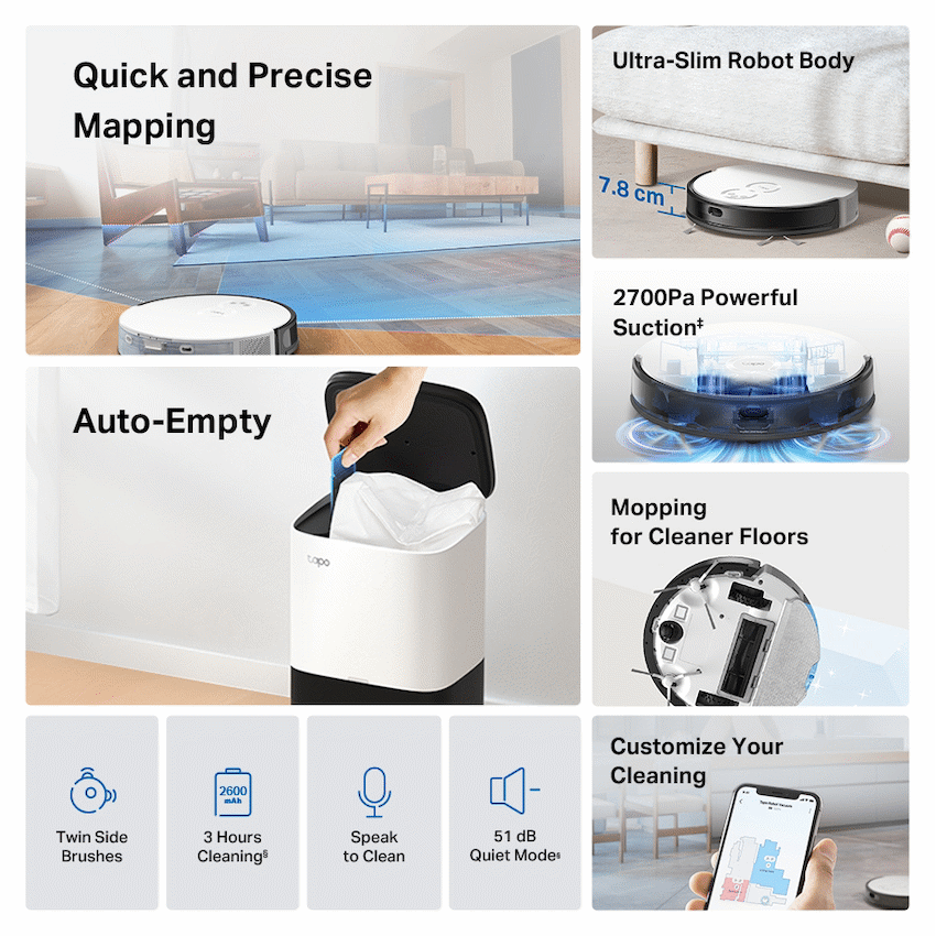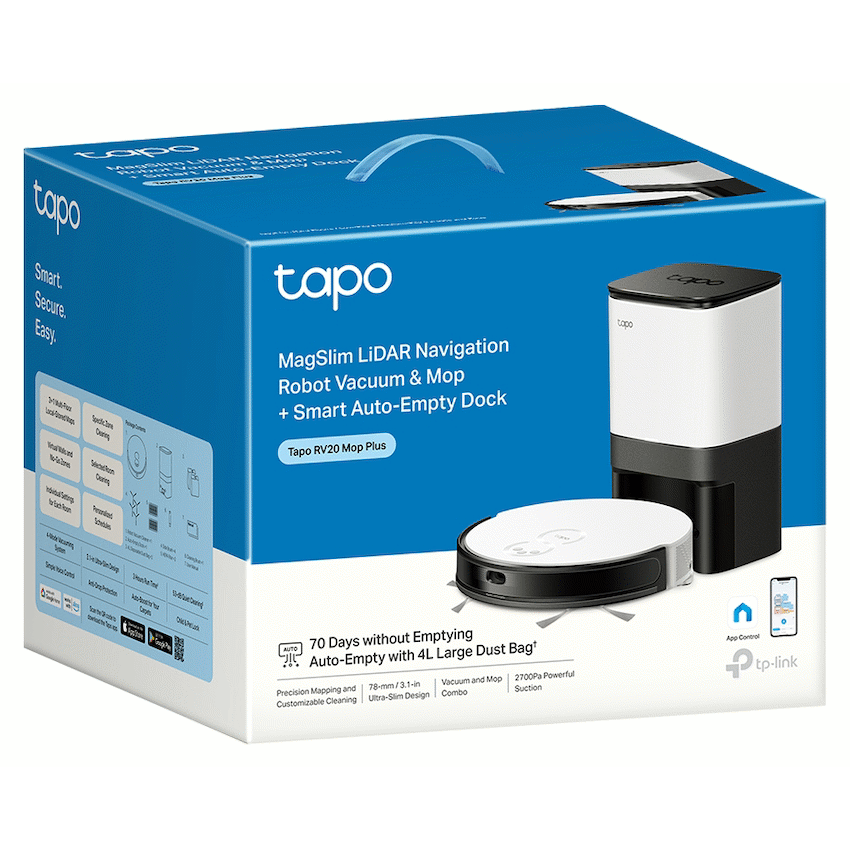 TP-Link Tapo RV20 Mop Plus Robot LIDAR Vacuum, 2600 mAhMagSlim(TM) LiDAR Navigation System: Accurately maps out your house in minutes, reducing omissions and repeated cleaning, and even works well in the dark.4-Level Suction Modes: 2700Pa Strong Suction. Easily clean pet hair, daily messes, and more.Vacuum and Mop Combo: Vacuuming sucks up floating dust and mopping tackles sticky messes.Twin Side Brushes: Takes care of corners and edges while preventing dirt from splashing for a more thorough clean.Auto-Empty with 4L Large Dust Bag: Automatically empties the dustbin after cleaning to keep your hands free for up to 70 days.+3-Hour Continuous Cleaning: 2600mAh battery for long-lasting cleaning.SUltra-Slim 7.8 cm Design: Moves freely under furniture to reach hidden dirt and grime that can’t escape its sweep.Customizable Cleaning: Merge and separate areas, set a cleaning schedule, and customize clean modes for each room.Quiet Cleaning: Cleans your home without disturbing you or your pets with a working volume of 51dB.SAuto-Charging: Returns to the charging dock automatically when the battery gets low, and then restarts right where it left off.OTA Updates Supported: Upgrade to the latest firmware via Tapo App for a better experience. More features to come.