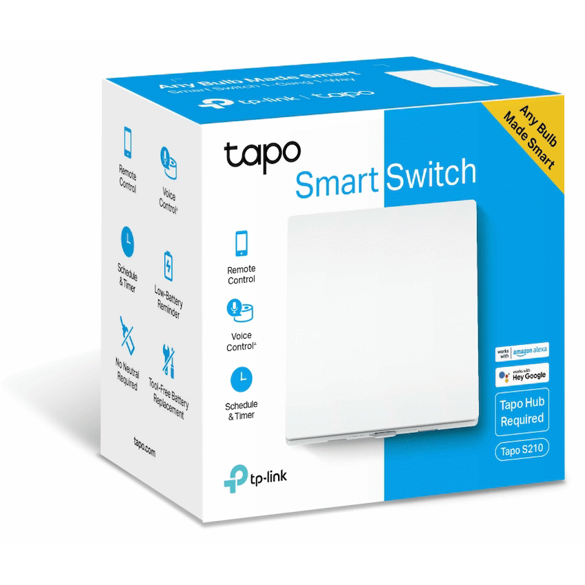 TP-Link Tapo S210 Smart Light Switch 1 Gang 1 WayRemote Control – Instantly turn the light on/off wherever you are through the Tapo app.Voice Control- Manage your switch with voice commands via Amazon Alexa or the Google Assistant.Schedule – Preset a schedule to automatically manage devices.Away Mode – Automatically turn the light on and off at different times to give the appearance that someone is home.Tool-Free Battery Replacement – Easily replace batteries after installation, no need of other tools.No Neutral Wire Required – Super easy wiring. No neutral wire required.