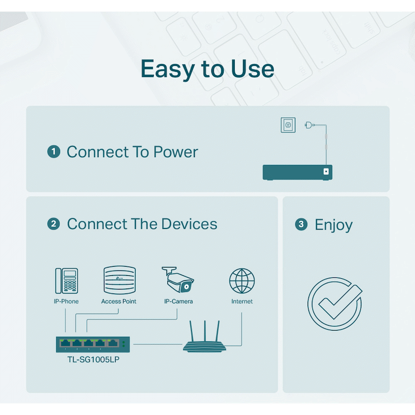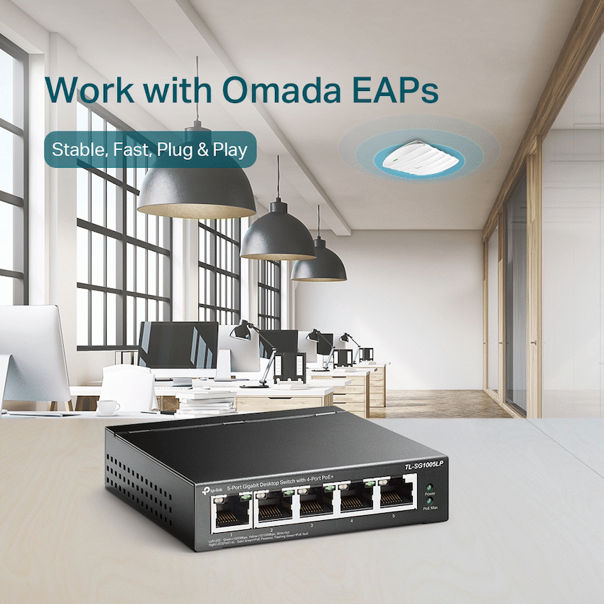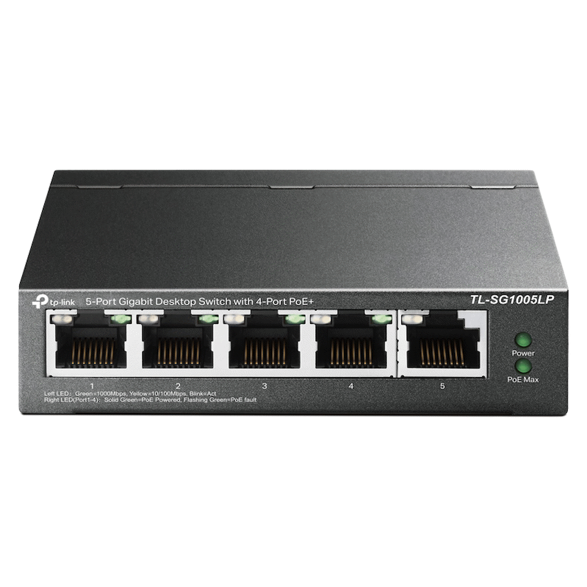 The TP-Link TL-SG1005LP is a compact and efficient 5-Port Gigabit Desktop Switch designed to meet the demands of small office and home networking environments. Featuring four PoE+ ports that support IEEE 802.3af/at standards, it allows users to power devices such as IP cameras, VoIP phones, and wireless access points directly through Ethernet cables, eliminating the need for separate power supplies. With a total PoE power budget of 65W and full Gigabit speeds across all ports, this switch ensures fast, reliable data transmission and simplified network expansion. Its plug-and-play setup requires no configuration, making it ideal for users seeking hassle-free installation. The fanless design ensures silent operation, while the durable metal casing provides long-lasting performance. Whether you’re building a surveillance system, expanding your office network, or deploying wireless access points, the TL-SG1005LP offers a powerful, cost-effective solution with seamless power and data integration.