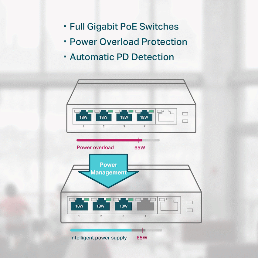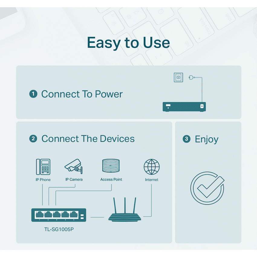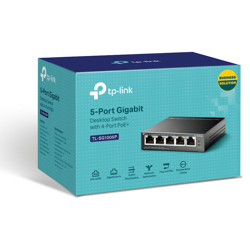 TP-Link TL-SG1005P 5-Port Gigabit Desktop Switch with 4-Port PoE+TL-SG1005PFeatures:- 5 x 10/100/1000Mbps RJ45 ports- With four PoE ports, transfers data and power on one single cable- Working with IEEE 802.3af compliant PDs, expands home and office network- 802.1p/DSCP QoS enable smooth latency-sensitive traffic- Supports PoE Power up to 15.4W for each PoE port- Supports PoE Power up to 56W for all PoE ports- Requires no configuration and installation PoE Switches for Your Ultra Convenience:- 5-Port Gigabit Desktop Switch with 4-Port PoE – TL-SG1005PSurveillance – Work with IP Cameras Conference Call – Work with IP Phones Wi-Fi Coverage – Work with Omada EAPsPower over Ethernet:4 of the 5 Auto-Negotiation RJ45 ports (Port 1 to Port 4) of the switch support Power over Ethernet (PoE) function. These PoE ports can automatically detect and supply power with those IEEE 802.3af compliant Powered Devices (PDs).Intelligent Power Management:When total power consumption excels 56W, the intelligent power management will cut the lower priority port power off to ensure the high priority port’s power supply and protect the device from power overload operation.Advanced Functions for Higher Performance:- Qos – For Fluent Online Experience- Administrators can designate the priority of traffic based on QoS, for example, to ensure that voice and video applications remain clear and lag-freeIGMP – Snooping – Traffic Optimization for IPTV:IGMP Snooping optimizes multimedia traffic delivery, to ensure a better network experience especially for applications like IPTV.Sturdy Metal Casing:Sturdy, compact metal casing and shielded RJ45 ports, with desktop/wall-mounting design, to meet your needs in any environment. Besides, fanless design ensures quiet operation.Specifications:Hardware Features:Interface- 5 10/100/1000Mbps RJ45 Ports- AUTO Negotiation/AUTO MDI/MDIXNetwork Media:- 10BASE-T: UTP category 3, 4, 5 cable (maximum 100m)- EIA/TIA-568 100? STP (maximum 100m)- 100BASE-TX: UTP category 5, 5e cable (maximum 100m)- EIA/TIA-568 100? STP (maximum 100m)- 1000BASE-T: UTP category 5, 5e, 6 or above cable (maximum 100m)- EIA/TIA-568 100? STP (maximum 100m)Fan Quantity: Fanless- External Power Supply: External Power Adapter(Output: 48VDC / 1.25A)- PoE Ports (RJ45): Standard: 802.3 af compliant- PoE Ports: Port1- Port4- Power Supply: 56W- Backbound Bandwidth: 10Gbps- Mac Address Table: 2K- Dimensions ( W x D x H ): 3.9 x 3.9 x 1.0 in. (99.8 x 98 x 25 mm)Max Power Consumption:- 3.95W(220/50Hz. no PD connected)- 64.44W(220/50Hz. with 56W PD connected)Max Heat Dissipation:- 13.48BTU/h(no PD connected)- 219.87BTU/h(with 56W PD connected)Software Features:Advanced Features:- Compatible With IEEE 802.3af Compliant PDs- Priority Function- Mac Address Auto-Learning And Auto-Aging- IEEE 802.3x Flow Control- 802.1p/DSCP QoS- IGMP Snooping- Transfer Method: Store-And-ForwardOthers:- Certification: FCC, CE, RoHSConsumption:- 4.26 watts (max. no PD connected)- 63.31 watts (max. with 56w PD connected)Environment:- Operating Temperature: 0?-40? (32?~104?)- Storage Temperature: -40?-70? (-40?~158?)- Operating Humidity: 10%-90%RH non-condensing- Storage Humidity: 5%-90%RH non-condensingWhat’s in the box1 x TL-SG1005P1 x Power Adapter1 x Installation Guide