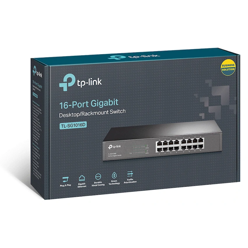 TP-Link TL-SG1016D 16-Port Gigabit SwitchThe TL-SG1016D Gigabit Ethernet Switch provides you with a high-performance, low-cost, easy-to-use, seamless and standard upgrade to improve old network to 1000Mbps network. All 16 ports support auto MDI/MDIX, no need to worry about the cable type, simply plug and play. Moreover, with the innovative energy-efficient technology, the TL-SG1016D can save power consumption and 80% of the packaging material can be recycled, making it an eco-friendly solution for your business network.16x 10/100/1000Mbps portsInnovative energy-efficient technology saves power consumptionSupports MAC address self-learning, Auto MDI/MDIX and Auto negotiationPlug & play designWhat’s in the box16-Port Gigabit Desktop/Rackmount SwitchPower CordInstallation GuideRackmount KitsRubber Feet