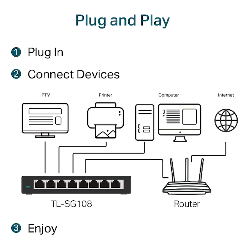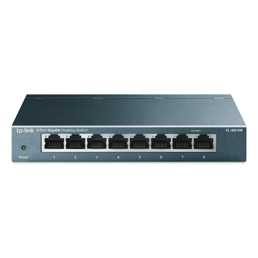 TP-Link TL-SG108 8-Port Gigabit Desktop SwitchWhat This Product DoesThe TP-LINK 8 10/100/1000Mbps Desktop Switch TL-SG108 provides you an easy way to make the transition to gigabit Ethernet. Increase the speed of your network server and backbone connections, or make gigabit to the desktop a reality. Moreover, TL-SG108 adopts lower power consumption design. With the innovative energy-efficient technology, the TL-SG108 can save up to 72% of the power consumption, making it an eco-friendly solution for your home or office network.Gigabit SwitchFeatured with 8 10/100/1000Mbps ports, TL-SG108 greatly expands your network capacity, enabling instant large files transferring. Sopower users in the home, office, workgroup, or creative production environment can now move large, bandwidth-intensive files faster. Transfer graphics, CGI, CAD, or multimedia files across the network instantly.Go Green With Your EthernetYou now have the choice to go green when upgrading to a gigabit network! This new generation TL-SG108 features the latest innovative energy-efficient technologies that can greatly expand your network capacity with much less power. It automatically adjusts power consumption according to the link status and cable length to limit the carbon footprint of your network.- Power down Idle PortsWhen a computer or network equipment is off, the corresponding port of a traditional switch will continue to consume considerable amounts of power. The TL-SG108 can automatically detect the link status of each port and reduce the power consumption of ports that are idle, resulting in up to an 72% reduction in power use.- Power Budget According to Cable LengthIdeally, shorter cable would use less power because of less power degradation over their length; this is not the case with most devices as they will use the same amount of power across the cable regardless of the length.What’s in the box1 x 8-Port 10/100/1000Mbps Desktop Switch1 x Power Adapter1 x Installation Guide