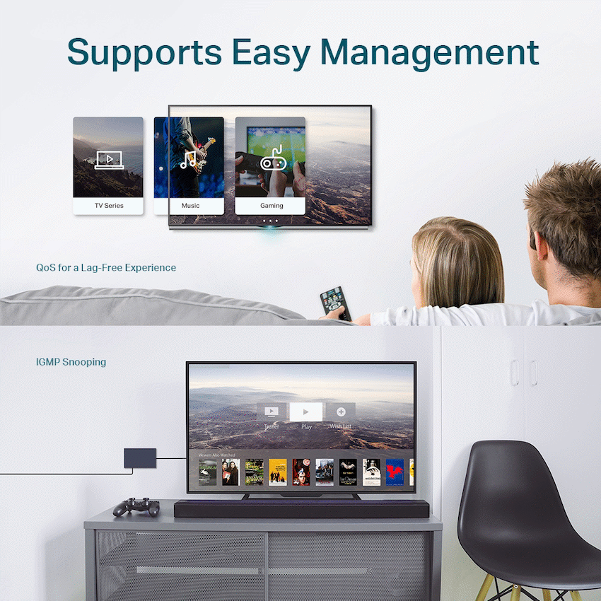 TP-Link TL-SG108E 8-Port Gigabit Easy Smart Switch is a versatile and reliable networking solution designed for home offices, small businesses, and professional environments that require high-speed connectivity with simple, intelligent management. Equipped with eight auto-negotiation 10/100/1000Mbps RJ45 ports, the switch delivers fast and stable Gigabit Ethernet performance for PCs, servers, network storage, printers, IP cameras, and other network-enabled devices.Offering true plug-and-play functionality, the TL-SG108E requires no initial configuration, allowing users to expand their network quickly and effortlessly. For enhanced control, the switch includes intelligent management features accessible through a web-based user interface and downloadable management utility, enabling easy monitoring of network status, traffic prioritization, and basic configuration without the complexity of fully managed switches.