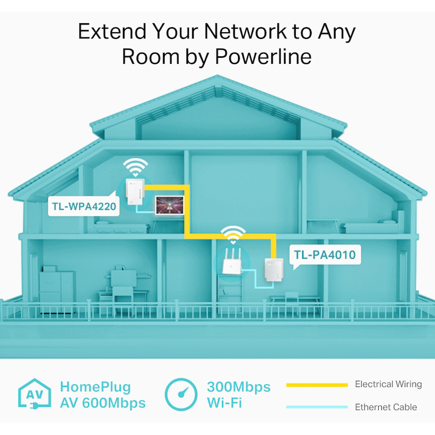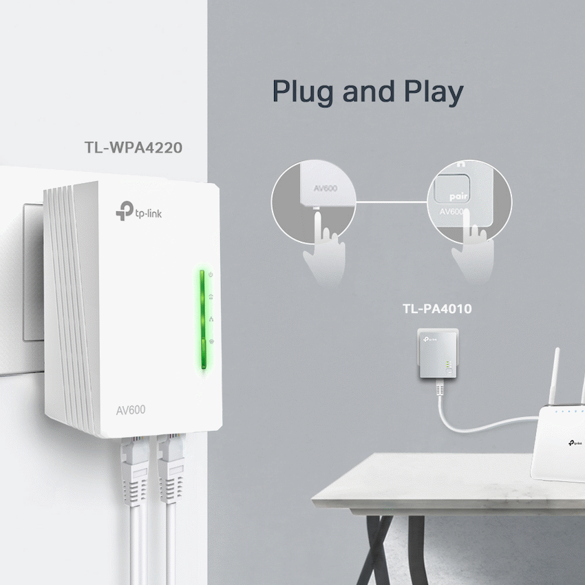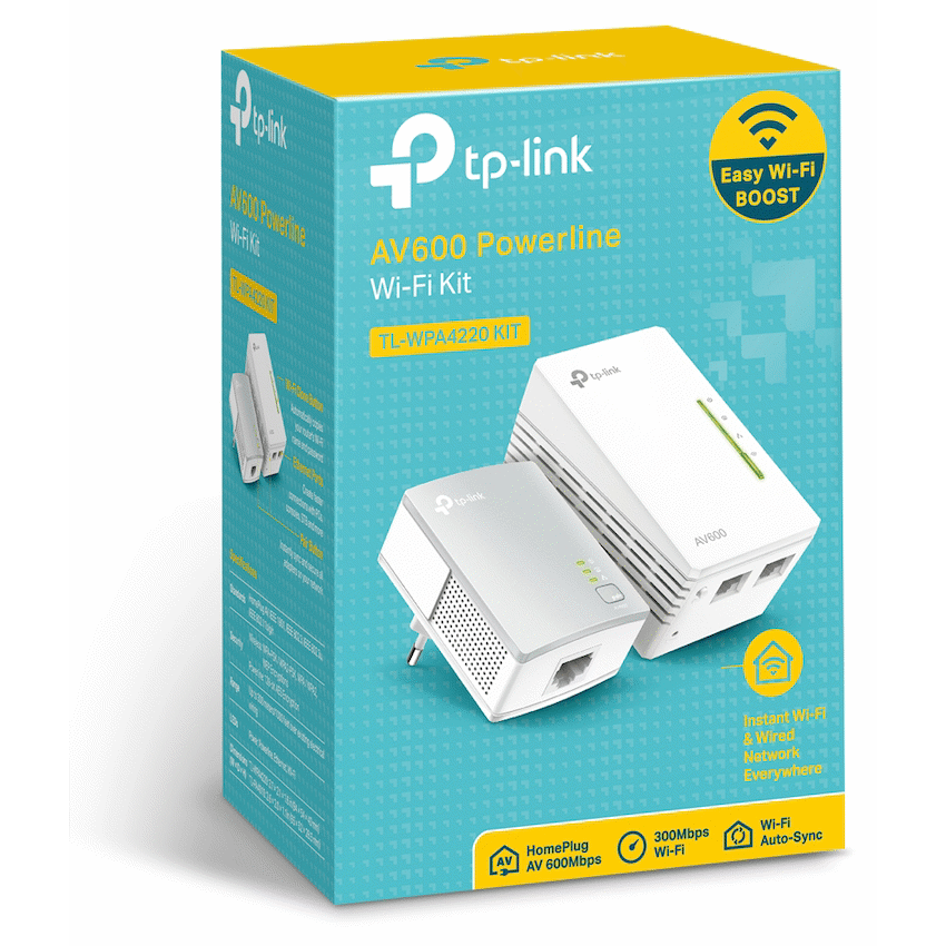 TP-Link TL-WPA4220 KIT AV600 Powerline Wi-Fi KitOne Touch Super Range ExtensionWi-Fi Clone Button simplifies your Wi-Fi configuration and helps build a seamless unified home network. Home Plug AV standard providing up to 600Mbps1 high speed data transmission over a home’s existing electrical wiring, ideal for lag-free HD or 3D video streaming and online gaming. Extend 300Mbps wireless connections to previously hard-to-reach areas of your home and office. Wired or Wireless Why not Both. Meet an Excellent Home Network Solution 300Mbps AV600 Wi-Fi Powerline Extender Starter Kit TL-WPA4220 KIT.Wi-Fi Auto-Sync for Unified Wi-Fi NetworkWi-Fi Auto-Sync creates a simple, intuitive powerline experience. Pressing the Wi-Fi Clone button instantly copies your network name and password from your router for easy setup. Wi-Fi Move automatically applies any settings changes across the network. Your existing Wi-Fi settings will be synchronized to the new extender automatically.Extend Your Powerline Network to Any RoomBased on the Powerline technology, your network extension is never limited to the primary coverage of your router. With advanced Home Plug AV2,TL-WPA4220 KIT is perfect for delivering ultra-fast data transfer speed and brings network to anywhere there is a power outlet.Plug, Pair and PlayPlug the TL-PA4010 in the wall and connect it to the router with an Ethernet cable. Then plug the TL-WPA4220 in any desired power outlet.Press the ‘Pair’ buttons on both adapters to create a secure network. There you go! Just enjoy the seamless, high speed wired and wireless network.Powerline Management on Your SmartphoneThe tpPLC Utility and tpPLC app make it easy to control wireless network settings, set schedules for Wi-Fi availability and even control the LED indicators on your adapters from any iOS or Android device. Powerline adapters need to be connected to the same electrical circuit.Specifications:- Plug Type: EU, UK, US, AR- Standards and Protocols: Home Plug AV, IEEE802.3, IEEE802.3u, IEEE802.11b/g/n- Interface: 2 x 10/100Mbps Ethernet Port- Button: Pair, Reset, Wi-Fi/Wi-Fi ClonePower Consumption:- Maximum: 7.608W (220V/50Hz)- Typical: 7.216W (220V/50Hz)- Standby: 4.610W (220V/50Hz)LED Indicator:PWR, PLC, ETH, Wi-Fi/Wi-Fi CloneDimensions ( W x D x H ):- TL-WPA4220: 2.1 x 1.6 x 3.7 in. (54 x 40 x 94 mm)- TL-PA4010: 2.0 x 1.1 x 2.6 in. (52 x 28.5 x 65 mm)Range:300 Meters over electrical circuitFrequency:2.4-2.4835GHzSignal Rate:- 11n: Up to 300Mbps(dynamic)- 11g: Up to 54Mbps(dynamic)- 11b: Up to 11Mbps(dynamic)Reception Sensitivity:- 270M: -68dBm@10% PER- 130M: -68dBm@10% PER- 108M: -68dBm@10% PER- 54M: -68dBm@10% PER- 11M: -85dBm@8% PER- 6M: -88dBm@10% PER- 1M: -90dBm@8% PERWireless Security:64/128-bit WEP / WPA / WPA2,WPA-PSK / WPA2-PSKAdvanced Functions:Enable/Disable Wireless Radio,WMM, Wireless StatisticsTransmission Power:- CE:- FCC:Modulation Technology:OFDM (PLC)Powerline Security:128-bit AESWireless Security:WEP, WPA/WPA2, WPA-PSK/WPA2-PSK EncryptionCertification:CE, FCC, RoHSSystem Requirements:Windows 2000/XP/2003/Vista, Windows 7/8, Mac, LinuxEnvironment:- Operating Temperature: 0 degrees Celsius to 40 degrees Celsius- Storage Temperature: -40 degrees Celsius to 70 degrees Celsius- Operating Humidity: 10%-90% non-condensing- Storage Humidity: 5%-90% non-condensingWhat’s in the boxPowerline Ethernet Adapter TL-WPA4220 & TL-PA40106.5 ft. (2 m) Ethernet cable (RJ45)Resource CDQuick Installation Guide