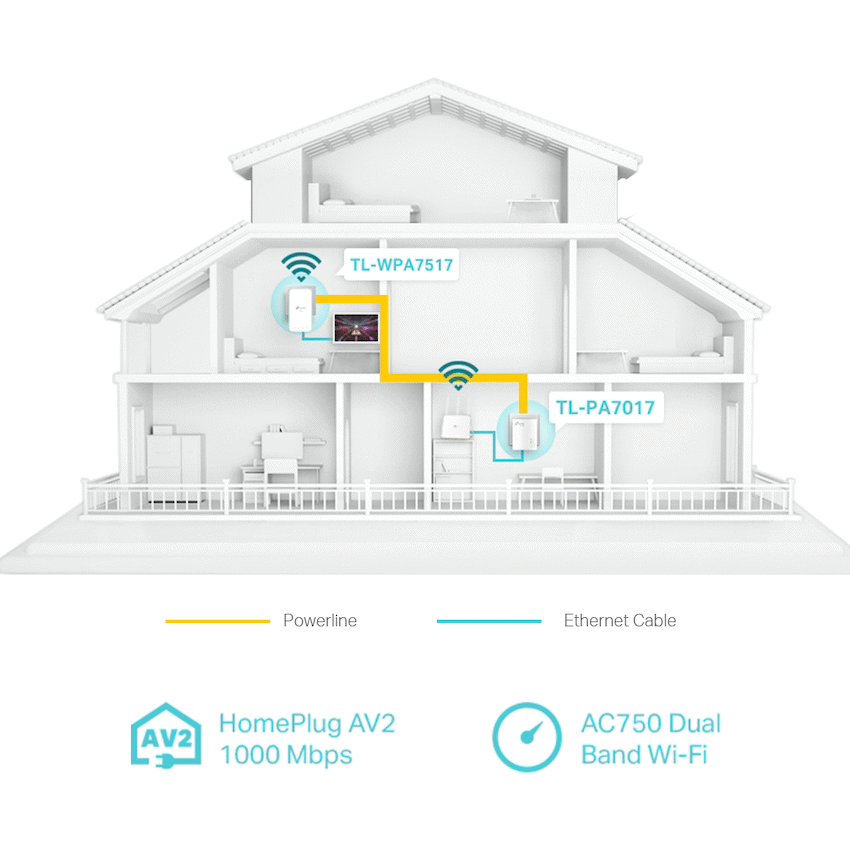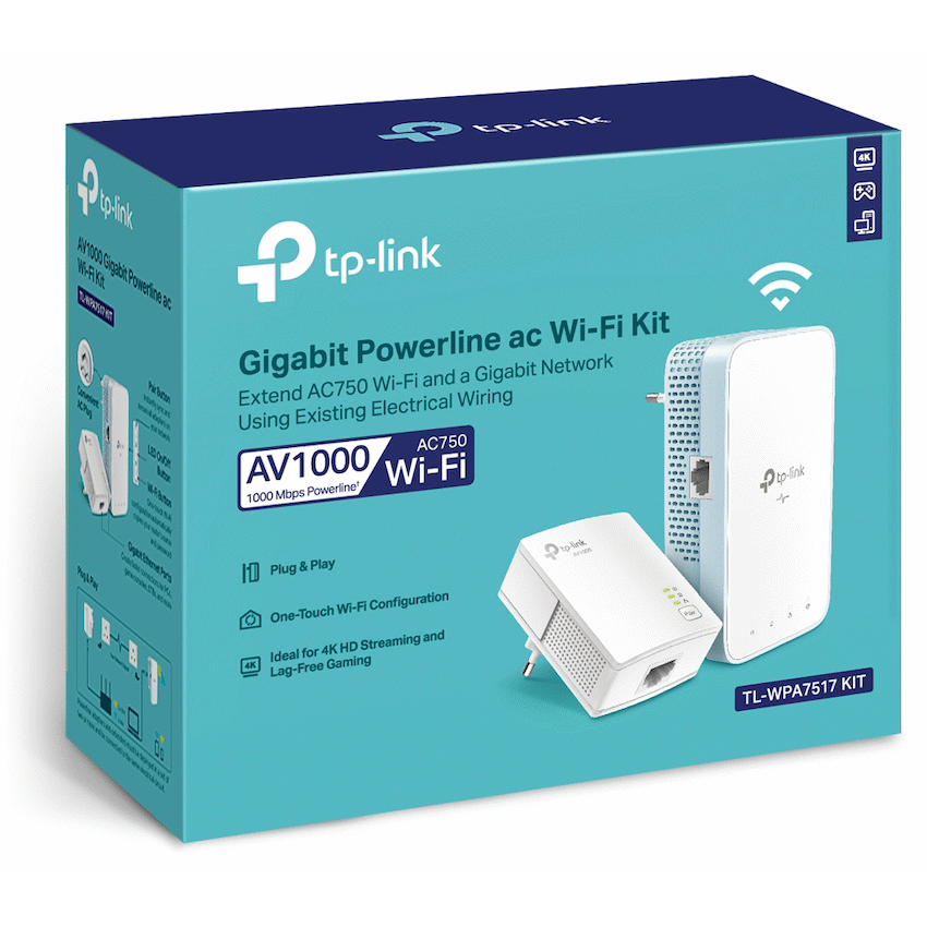TP-Link TL-WPA7517 KIT AV1000 Powerline Wi-Fi KitHomeplug AV2 standard compliant – Provides users with stable, high-speed data transfer rates of up to 1000 Mbps on a line length of up to 300 metersDual band 802.11ac Wi-Fi – AC750 dual band Wi-Fi (433Mbps on 5GHz & 300Mbps on 2.4GHz) allows streaming, gaming, emailing, browsing and posting on your wireless devices, throughout your homeWi-Fi Auto-Sync – Simply copy your router’s Wi-Fi settings and apply any changes across the secure powerline network with Wi-Fi Clone and Wi-Fi MoveGigabit Ethernet Port – Provide reliable high-speed wired connections for game consoles, smart TVs, and NASPlug, Pair and Play – Quickly set up a secured Powerline network