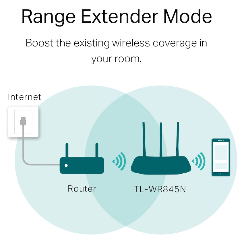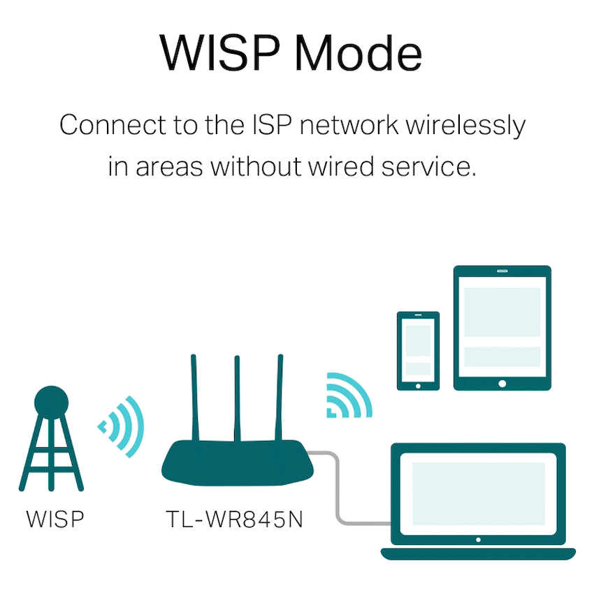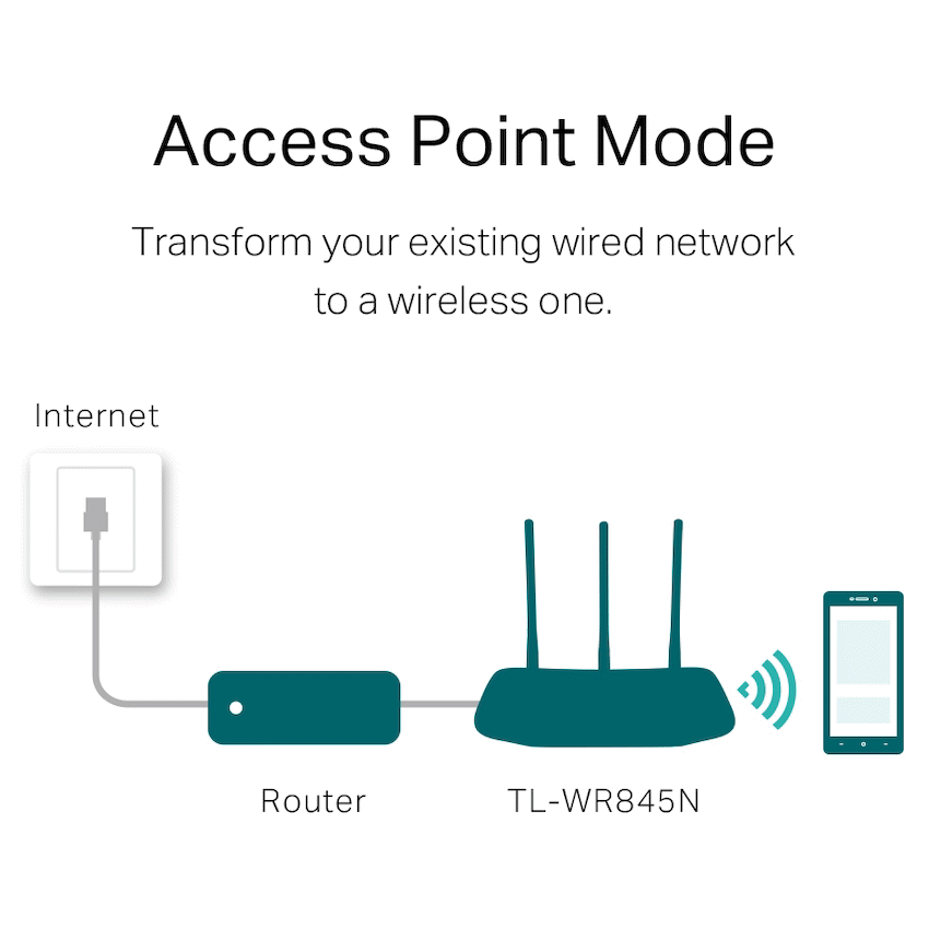 TL-WR845N300Mbps Wireless N Router300Mbps wireless speed ideal for interruption sensitive applications like HD video streamingThree antennas greatly increase the wireless robustness and stabilityEasy wireless security encryption at a push of WPS buttonIP based bandwidth control allows administrators to determine how much bandwidth is allotted to each PCCompatible with IPv6 -the more recent Internet Protocol versionTP-LINK Tether App allows quick installation and easy management using any mobile deviceSpeedy Wireless N300The TL-WR845N provides speedy and stable Wi-Fi for your network needed devices. Up to 300Mbps wireless speedmakes it a practical solution for home network applications like files download, video chat or online streaming.Greater Coverage and Enhanced ReliabilityThree 5dBi high gain antennas perfect for small to medium house, a better coverage lets you never lost connections and enjoy more stable connection.Access Point ModeTransform your existing wired network to a wireless one.Range Extender ModeBoost the existing wireless coverage in your room.WISP ModeConnect to the ISP network wirelessly in areas without wired service.Delicate AppearanceThe new design with elegant texture makes it a stylish addition to the decor of any room in your home.Guest Network AccessGuest Network function provides secure access for guests to sharing your Wi-Fi network. Easy sharing, no worry about your private network.Easy Parental ControlParent Control allows parents or administrators to deploy restricted access for children or staff. With URL blocking, you can easily set up a black or white list to limit the level of web access.Easy Setup and ManagementSet up the TL-WR845N in minutes thanks to its intuitive web interface and the powerful Tether app. TP-Link Tether app provides the easiest way to access and manage your router on your smartphone, allows you to start enjoying your new device faster.SpecificationsHARDWARE FEATURESInterface : 4 x 10/100Mbps LAN PORTS1 x 10/100Mbps WAN PORTButton : Reset ButtonWPS : ButtonExternal Power Supply : 9VDC / 0.6AWireless Standards : IEEE 802.11n, IEEE 802.11g, IEEE 802.11bDimensions ( W x D x H ) : 9.1 x 5.7 x 1.4 in.(230 x 144 x 35 mm)Antenna : 3 x 5dBi fixed Omni Directional Antennas (RP-SMA)WIRELESS FEATURESFrequency : 2.4-2.4835GHzSignal Rate :11n: Up to 300Mbps(dynamic)11g: Up to 54Mbps(dynamic)11b: Up to 11Mbps(dynamic)Reception Sensitivity :270M: -70dBm@10% PER130M: -74dBm@10% PER108M: -74dBm@10% PER54M: -77dBm@10% PER11M: -93dBm@8% PER6M: -95dBm@10% PER1M: -98dBm@8% PERTransmit Power : CE: FCC : Wireless Functions : Enable/Disable Wireless Radio, WMM, Wireless StatisticsWireless Security : WEP, WPA/WPA2,WPA-PSK/WPA2-PSKSOFTWARE FEATURESQuality of Service : WMM, Bandwidth ControlWAN Type : Dynamic IP, Static IP, PPPoE, PPTP(Dual Access), L2TP(Dual Access), BigpondManagement :Access ControlLocal ManagementRemote ManagementDHCP : Server, DHCP Client List, Address ReservationPort Forwarding : Virtual Server,Port Triggering, UPnP, DMZDynamic DNS : DynDns, Comexe, NO-IPVPN Pass-Through : PPTP, L2TP, IPSec (ESP Head)Access Control : Parental Control, Local Management Control, Host List, Access Schedule, Rule ManagementFirewall Security : DoS, SPI Firewall, IP and MAC Address BindingProtocols : Support IPv4 and IPv6Guest Network : 2.4GHz Guest Network x1OTHERSCertification : CE, RoHSSystem Requirements :Microsoft Windows 10/8.1/8/7/Vista/XP/2000/NT/98SE, MAC OS,NetWare, UNIX or LinuxInternet Explorer 11, Firefox 12.0, Chrome 20.0, Safari 4.0, or otherJava-enabled browserCable or DSL ModemSubscription with an Internet Service Provider (for internet access)Environment :Operating Temperature: 0?~40? (32? ~104?)Storage Temperature: -40?~70? (-40? ~158?)Operating Humidity: 10%~90% non-condensingStorage Humidity: 5%~90% non-condensingWhat’s in the box1 x Wireless Router TL-WR845N1 x Power Adapter1 x RJ45 Ethernet Cable1 x Quick Installation Guide