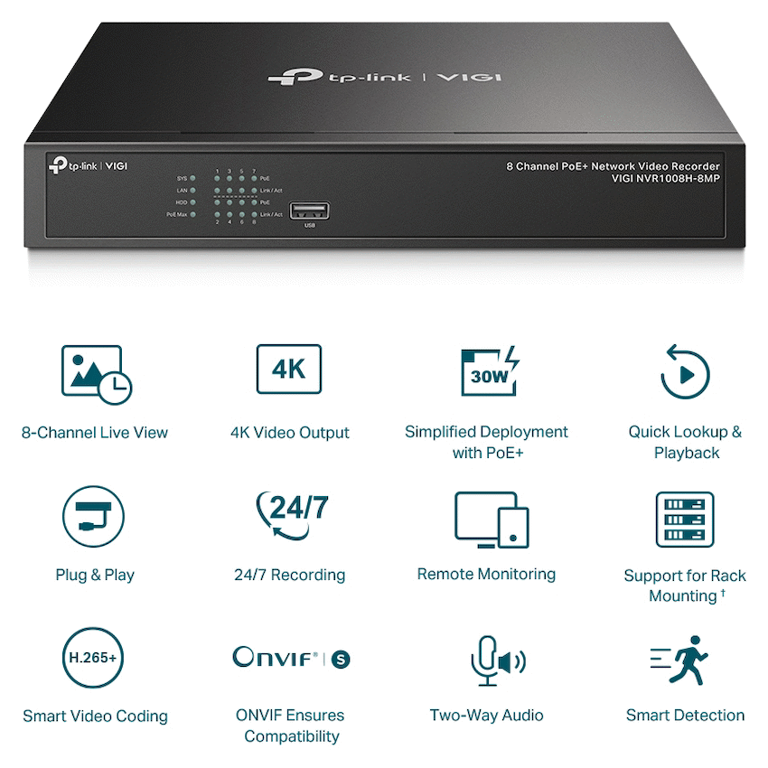 TP-Link Vigi NVR1008H-8MP 8 Channel PoE Network Video Recorder4K HDMI Video Output & 16MP Decoding Capacity: Sharp image definition up to 8MP and an 8-channel display ensures you capture every detail, from every angle++.Simplified Deployment with PoE+: Easily connect and power your PoE camera with one RJ45 cable transmitting both data and power. No power adapter needed.8-Channel Simultaneous Playback*: Replay the feed from up to 8 cameras at the same time, increase replay speed, and find events in the video schedule to easily review footage.H.265+: Without using any extra bandwidth, your camera transmits compressed crystal-clear video to save disk space, ease network loads, and reduce monitoring costs without sacrificing image quality.ONVIF Ensures Compatibility?: Easily add IPCs from VIGI and other brands to establish a powerful and varied network thanks to barrier-free compatibility.Plug & Play: Allows new and unused VIGI IP Cameras to be added automatically to the new NVR and activated instantly, making installation faster than ever before.24/7 Continuous Recording: Stores up to 10 TB of footage from connected cameras to secure your data for quick, convenient access.Remote Monitoring: The dedicated VIGI app, web UI, and VIGI Security Manager enable remote monitoring, providing ease and convenience.Flexible Installation: Choose the suitable installation method by simply housing your NVR on a rack, or placing it on or under a desk for greater convenience.Two-Way Audio: With voice intercom support, carry two-way conversations while watching your feed from anywhere. Suitable for management.
