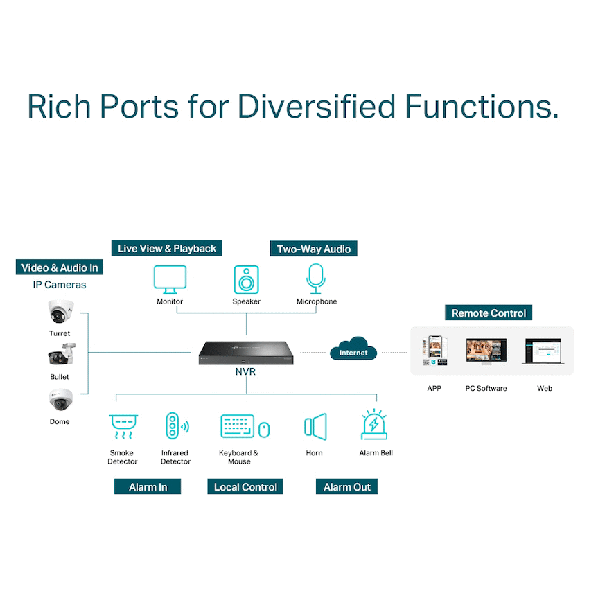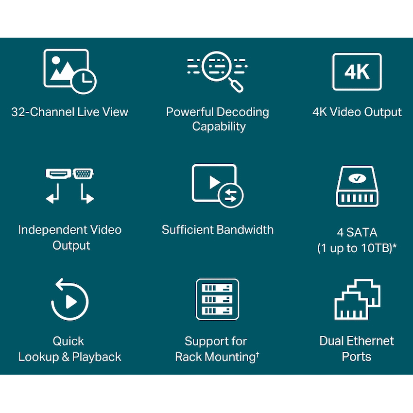 TP-Link Vigi NVR4032H 32 Channel Network Video RecorderFace Recognition: Enhances access management and maximizes security.Smart Search by Motion and Object: Quickly find target footage for improved playback efficiency.H.265+: Without using any extra bandwidth, your camera transmits compressed crystal-clear video to save disk space, ease network loads, and reduce monitoring costs without sacrificing image quality.320 Mbps Incoming and Outgoing Bandwidth: Ensures your NVR manages more cameras with high resolutions.Mass Storage: Supports 4x SATA, up to 10 TB each16-ch@2MP/ 8-ch@4MP Decoding Capacity+: Allows you to enjoy more channels, live view, and playback at the same time.1 HDMI and 1 VGA Interface: Supports independent video output.16-Channel Simultaneous Playback: Replay the feed from up to 16 cameras at the same time, increase replay speed, and find events in the video schedule to easily review footage.Plug & Play: Allows new and unused VIGI IP Cameras to be added automatically to the new NVR and activated instantly, making installation faster than ever before.Remote Monitoring: The dedicated VIGI app, web UI, and VIGI Security Manager enable remote monitoring, providing ease and convenience.Two-Way Audio: With voice intercom support, carry two-way conversations while watching your feed from anywhere. Suitable for management.ONVIF Ensures Compatibility: Easily adds IPCs from VIGI and other brands to establish a powerful and varied network thanks to barrier-free compatibility.