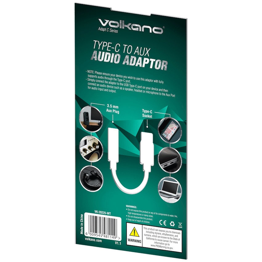 Have AUX headphones or Earphones but only a TypeC doc, no need to worry. The Volkano Adapt C series Type-C to AUX audio adaptor is the adaptor for you.What’s in the box1 x Volkano Adapt C series Type-C to AUX audio adaptor