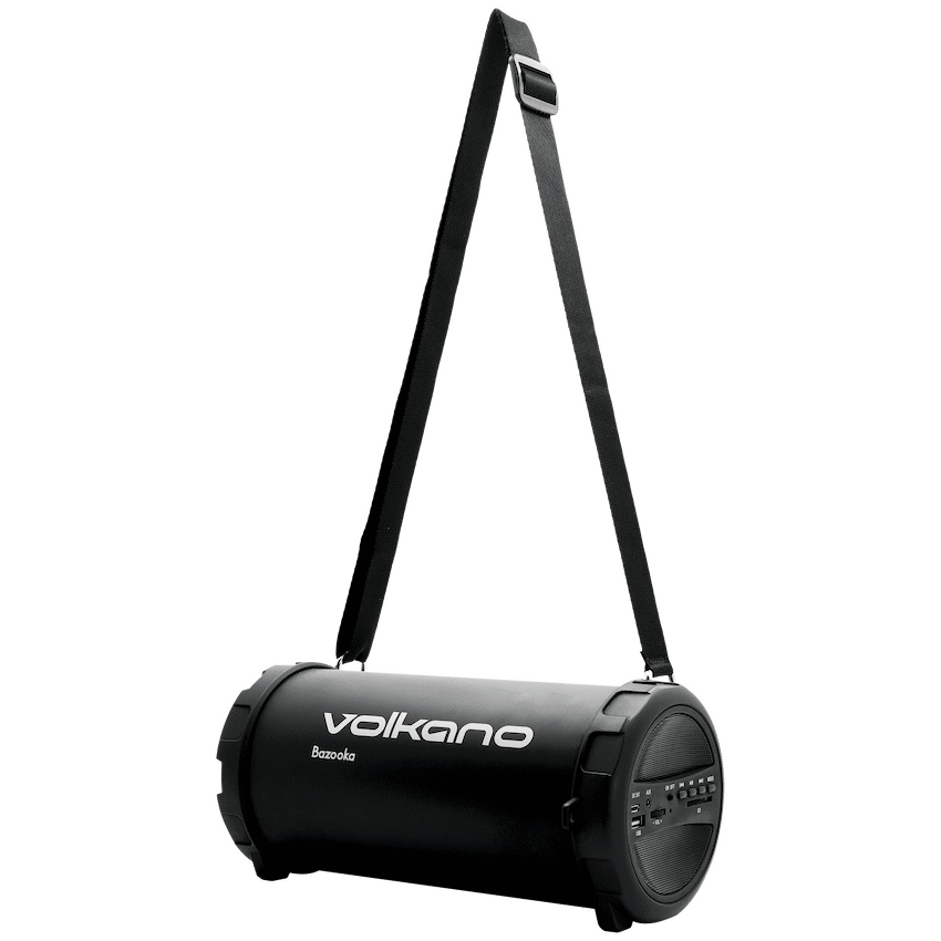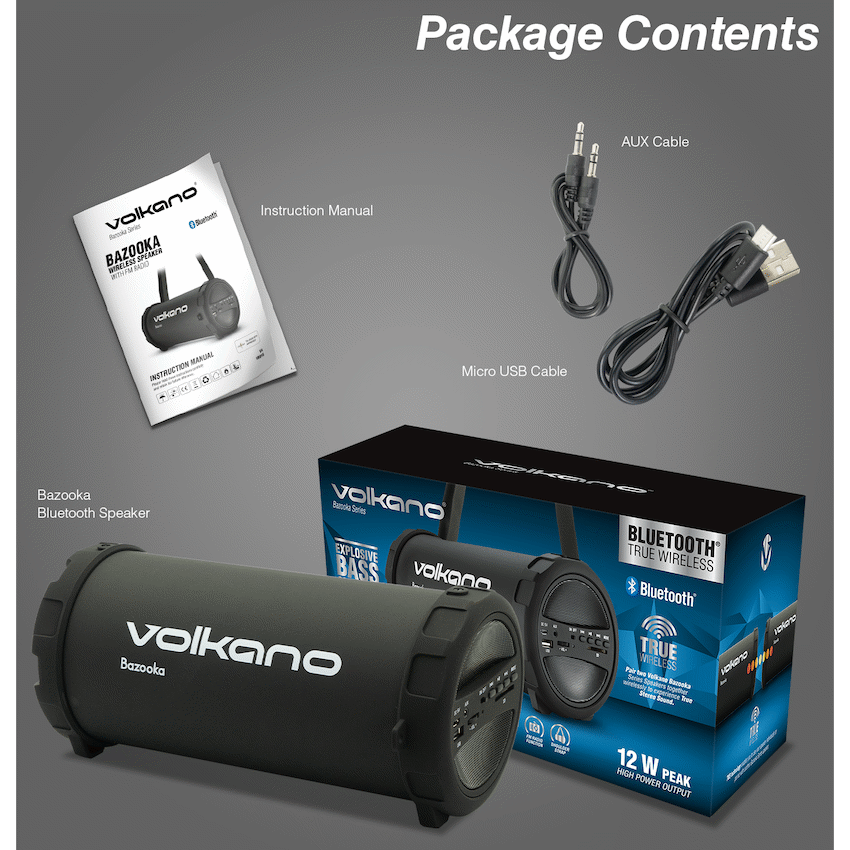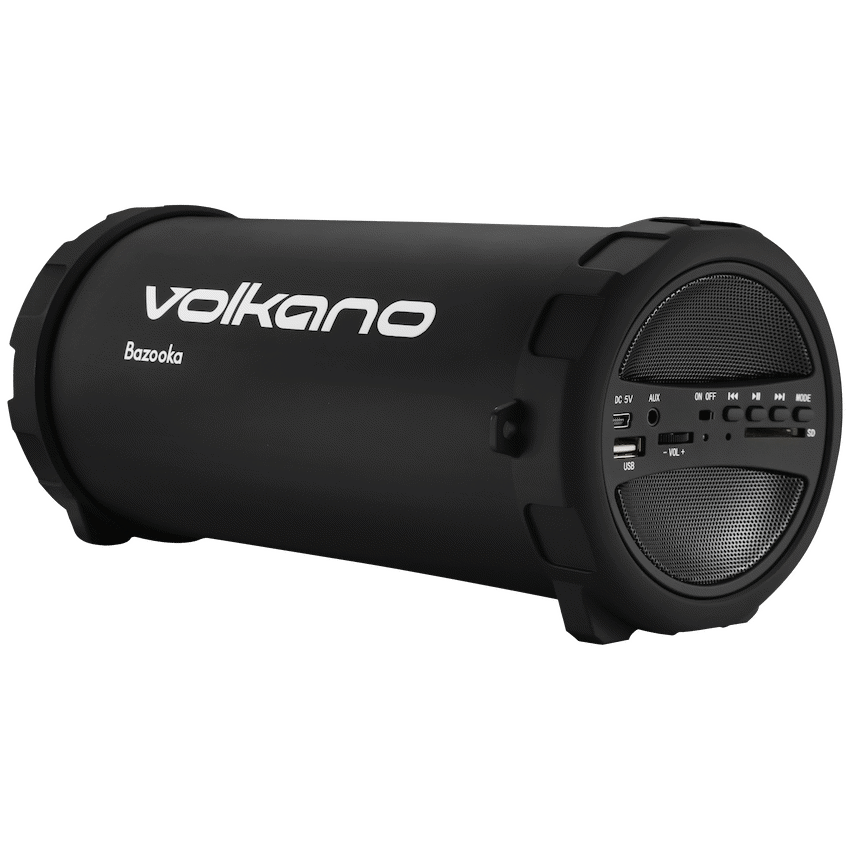 The original Volkano Bluetooth speaker and still one of our top sellers, the Volkano Series Bazooka True Wireless Speaker boasts explosive bass and scorching sound for its small size. The speaker features 12W of peak power in a unique barrel design to amplify low notes for rich, deep bass. Connect your favorite music player via Bluetooth or aux in; or plug in a USB drive, SD Card or activate FM Radio mode for instant sound. Control everything integrated playback and volume controls. Lightweight and portable, the Volkano Bazooka comes with a carry strap, so you can take your music with you wherever you go. The sturdy design is finished in a rubberized touch to prevent bumps and scrapes. Featuring True Wireless Technology, you can pair two Volkano Bazooka Series Speakers together wirelessly to experience True Surround Sound.