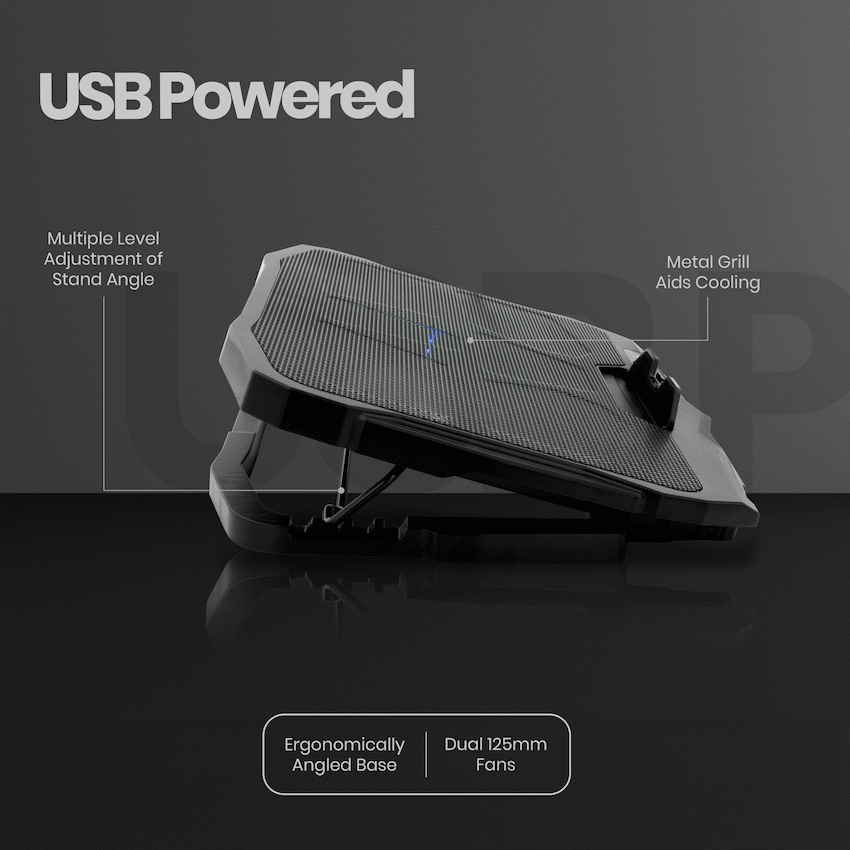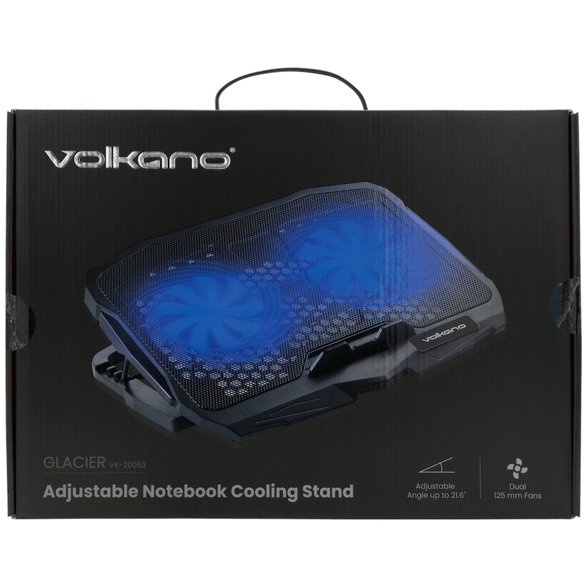 Keep your laptop performing at its best with the Volkano Glacier Series Upright Notebook Cooling Stand. Built for both function and comfort, this stand features dual 125 mm cooling fans with a striking blue LED backlight, ensuring your laptop stays at an optimal temperature even during demanding use.Designed with ergonomics in mind, the base offers an adjustable angle of up to 21.6deg, helping you find the perfect viewing position while improving posture and comfort during long sessions. Powered directly via USB, it requires no external power supply-simply plug it in and enjoy effective, quiet cooling.Stylish, reliable, and practical, the Volkano Glacier Series is the ideal companion for students, professionals, and gamers who want to extend the life of their laptops while working comfortably.