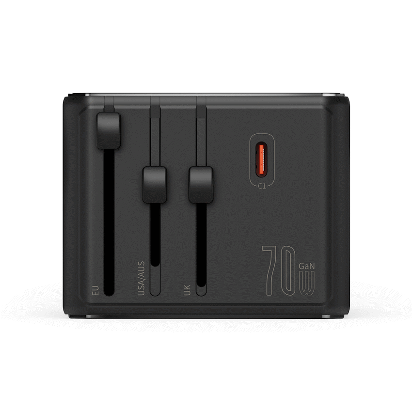 Travel smarter with this universal travel adapter designed for International travellers or powering multiple devices at home and the office. With 3 AC sockets plus 5 USB ports (3x USB-C and 2x USB-A), you can charge phones, tablets, and more from a single wall outlet. The 70W GaN USB-C1 port delivers efficient fast charging while keeping heat and size to a minimum, and Smart IC intelligently allocates power for safe, reliable performance. Integrated plug sliders cover USA, UK, EU, and AUS standards, enabling use in 150+ countries. A replaceable 10A overload fuse and LED power indicator add peace of mind. Compact and portable, it’s the all-in-one travel adapter with USB you’ll reach for daily.