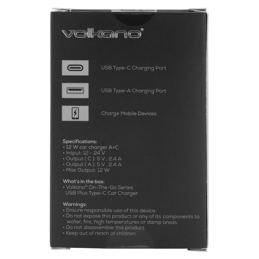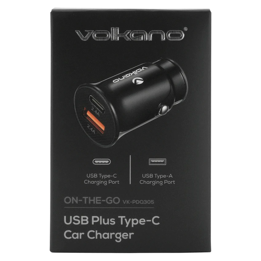 Volkano On-The-Go USB + Type-C 12w Car Charger – Black