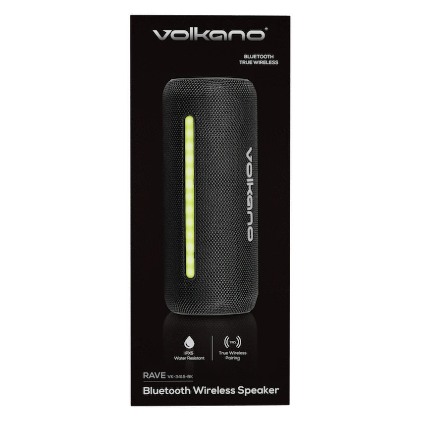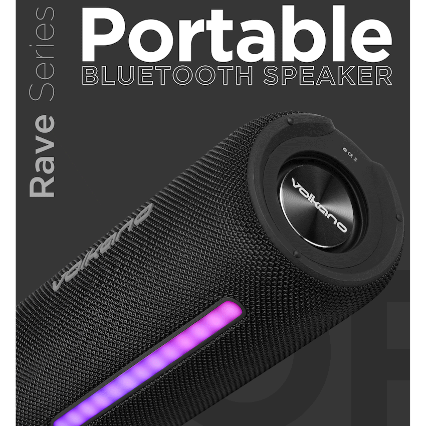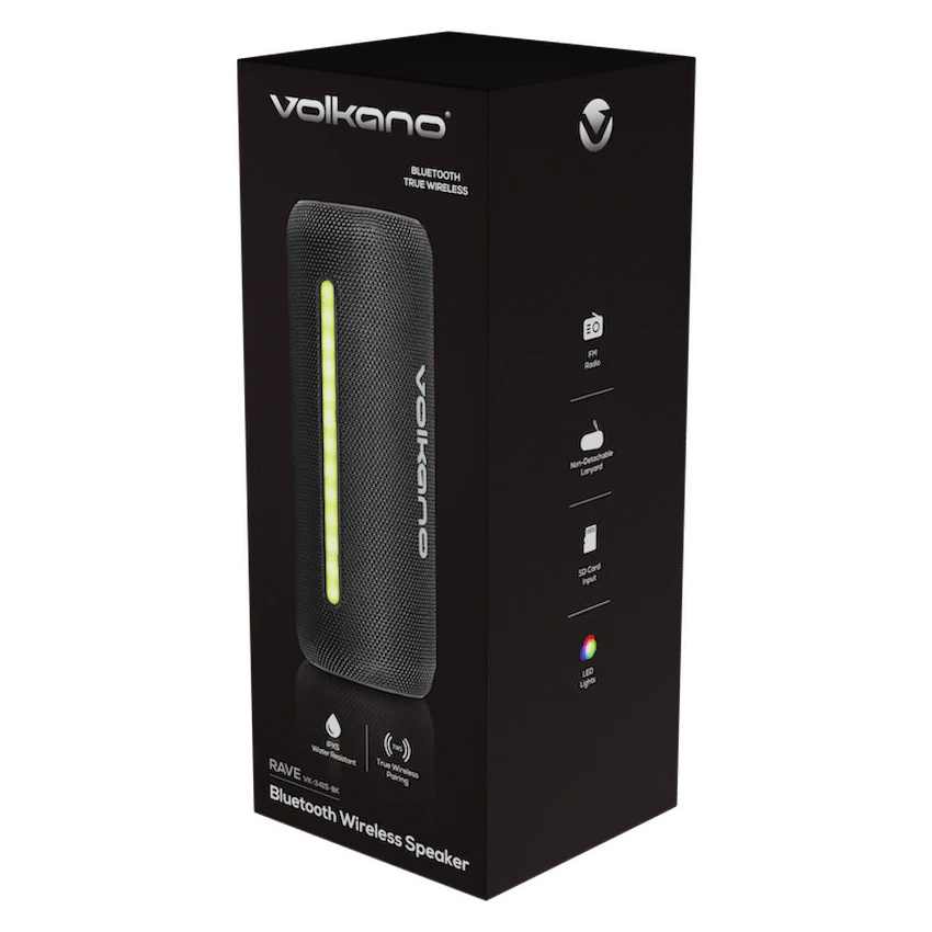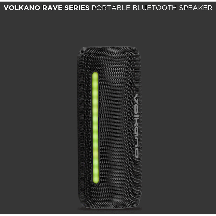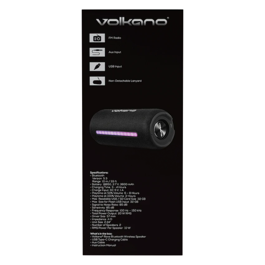Introducing the Volkano Rave Series Portable Bluetooth Speaker, a powerhouse of sound and style designed for those who appreciate top-notch performance and versatility. This speaker boasts impressive features that make it a must-have for any music enthusiast.Specifications:Cutting-Edge Connectivity: With Bluetooth version 5.3 and a JL AC6926A chipset, the Volkano Rave ensures a seamless and reliable connection within a range of 10 meters, giving you the freedom to move without compromising on sound quality.Powerful Audio Performance: Featuring a 57mm driver and a frequency range of 100Hz to 150kHz, this speaker delivers exceptional clarity and depth, creating a captivating audio experience for any genre.Long-Lasting Battery: Equipped with a robust 3600mAh battery, enjoy up to 8 hours of uninterrupted playback on a single charge. The 4-ohm impedance and 20W RMS output ensure a powerful and immersive sound experience.Versatile Charging Options: Charge up in just 4 hours with the included 5V DC/1A charging input, ensuring your speaker is always ready to accompany you on your adventures.Features and Benefits:Durable and Splash-Proof: With an IPX5 rating, the Volkano Rave is built to withstand the elements, making it the perfect companion for outdoor activities and parties.Multicolor LED Light Show: Set the mood with 11 dynamic LED light modes that sync with your music, creating a visually stunning and immersive atmosphere.True Wireless Pairing: Elevate your sound experience by wirelessly pairing two Volkano Rave speakers for true stereo sound, enhancing your audio setup for an even more captivating listening experience.Built-In FM Radio: Stay connected to your favorite radio stations on-the-go, adding a touch of variety to your music selection.Experience the ultimate in portable audio with the Volkano Rave Series Bluetooth Speaker – where cutting-edge technology meets stylish design for an audio adventure like no other.Specifications: Bluetooth Version: 5.3Chipset: JL AC6926A Bluetooth Distance: 10m Sensitivity: 85dB Driver: 57 mm Frequency: IOOHz – 150kHz Battery: 3600mAh Impedance: 4 Ohm Charging Time:4 hours Playback Time: Up to 8 hours Charging Input: 5V DC / IA 20W RMS outputFeatures and Benefits: IPX5 11 LED light Modes True Wireless Pairing FM Radio Up to 8 hours playtime 20W RMSWhat’s in the box1 x Volkano Rave Series Bluetooth Speaker1 x Charging Cable