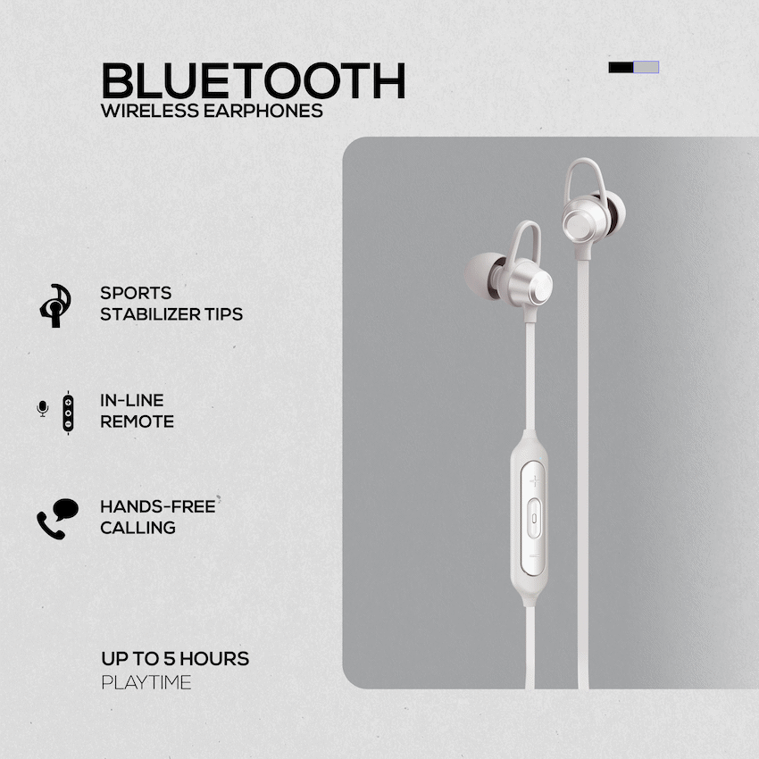 Features: – Cable Length Adjuster: Any extra earphone cable wire can be clamped using this nifty accessory, allowing you the optimal cable length. – Earbud Caps: Small, medium and large caps are included; you can choose whichever gives you the best fit. – In-Line Remote: You can easily adjust the volume, skip tracks, play, pause and answer calls using the in-line remote. – These earphones are sweat resistant, giving you even more comfort in more demanding activities. – Up to 5 hours of playtime will keep you going on the move.Specifications: – Chipset: BK – Bluetooth Version: 4.2 – Bluetooth Profiles: HFP, HSP, A2DP, AVRCP – Playback Time: 3 – 5 hrs – Battery Capacity: 55 mAh – Charge Time: 2 hrs – Impedance: 32 ? – Sensitivity: 98 dB – Driver: 10 mm – Power Requirement: 5V DC , 1A – Frequency Response: 20 Hz – 20 kHzWhat’s in the box1 x Bluetooth Earphones