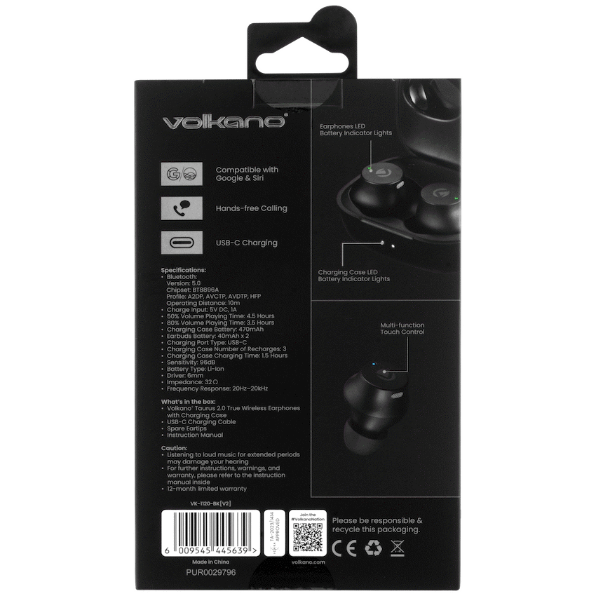 Elevate your audio experience with the Volkano Taurus Series 2.0 True Wireless Earphones in a sleek Black finish. Designed for seamless connectivity and unparalleled sound quality, these earphones are a perfect companion for your wireless and immersive musical journey.The compact charging case, housing a 470mAh battery, ensures your earphones stay charged on the go, providing up to 2.5 additional charges. With a USB charge input of DC 5V, 1A, and a convenient Type-C charging input, keeping your earphones ready has never been more effortless.Each earphone, with a 40mAh battery, delivers a quick 1.5-hour charge time for 5 to 7 hours of continuous playback. The 6mm driver size, 32 impedance, and 96dB sensitivity guarantee a rich and detailed audio experience, with a frequency response spanning from 20 Hz to 20 kHz.Rated at IPX4, the Volkano Taurus Series 2.0 is resistant to splashes, making them ideal for workouts, commutes, and everyday use. Dive into a world of untethered audio freedom with the Volkano Taurus Series 2.0 True Wireless Earphones – where style meets superior sound.Features and Benefits:Individually pair and experience True Wireless Sound (TWS) for unrestricted music enjoyment.Stay connected on the move with hands-free calling for seamless communication.Enjoy up to 18 hours of playtime with the charging case, making these earphones perfect for long journeys and daily activities.Specifications:Bluetooth Version: V5.2Chipset: BluetrumRange: Up to 10mCharging Case Battery: 470 mAhNumber of Charges: 2.5 TimesUSB Charge Input: DC 5 V, 1 ACharging Input: Type-CEarphones Battery: 40 mAh per EarphoneCharging Time: 1.5 HoursPlaying Time: 5 – 7 HoursDriver Size: 6 mm Impedance: 32 Sensitivity: 96 dBFrequency Response: 20 Hz – 20 kHzIPX4What’s in the box1 x Volkano Taurus Series True Wireless Earphones1 x 300 mAh Charging Case1 x USB Charging Cable1 x Instruction Manual