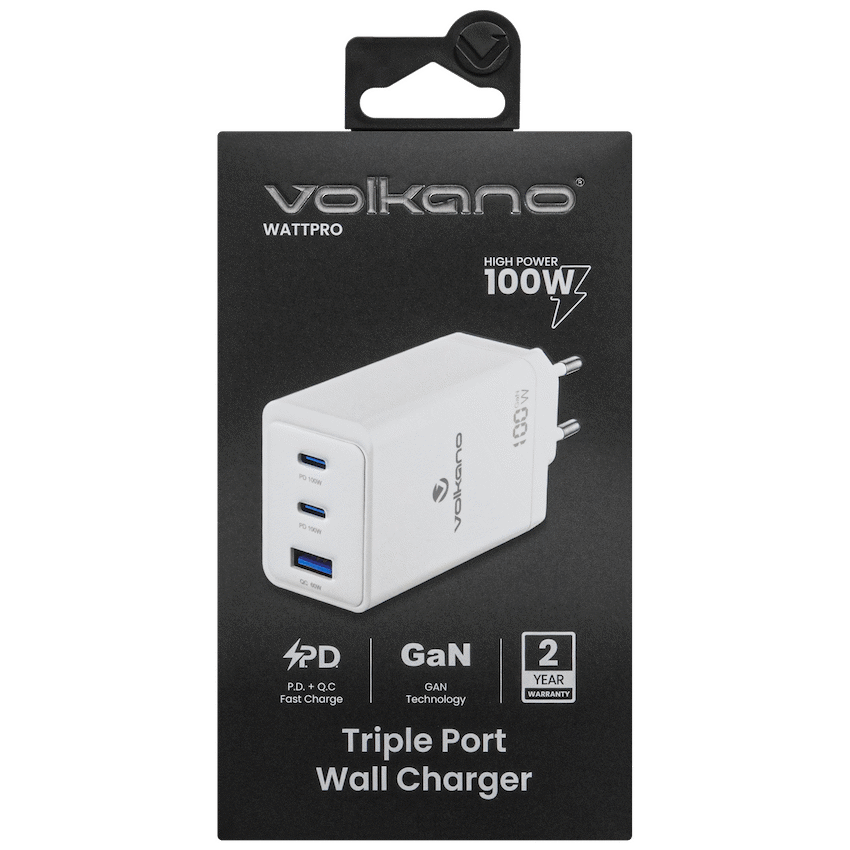 Volkano WattPro Series Triple Port 100W GanN Wall Charger – White