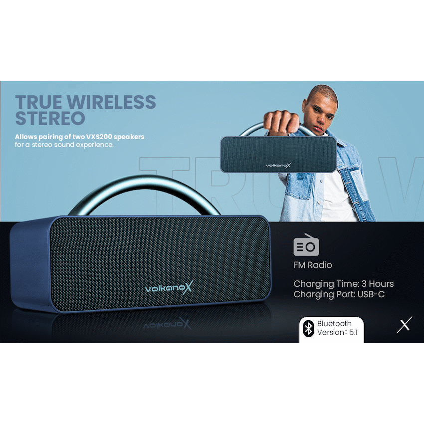 SPECIFICATIONS: Bluetooth Version: 5.1 Chip Set: JL Profiles: HFP / A2DP / AVRCP Operating Distance: 10 m Frequency Response: 80Hz – 16kHz Battery Capacity: 1800mAh Charge Time: 3 Hours Playback Time: Up to 10 Hours Power Requirement: 5 V DC , 2 A Sensitivity: 88dB Impendence: 3 Ohm 20W RMS OutputFEATURES AND BENEFITS: Up to 10 Hour Playback IPX level: IPX5What’s in the box1 x Volkano X VXS200 Portable Bluetooth Speaker