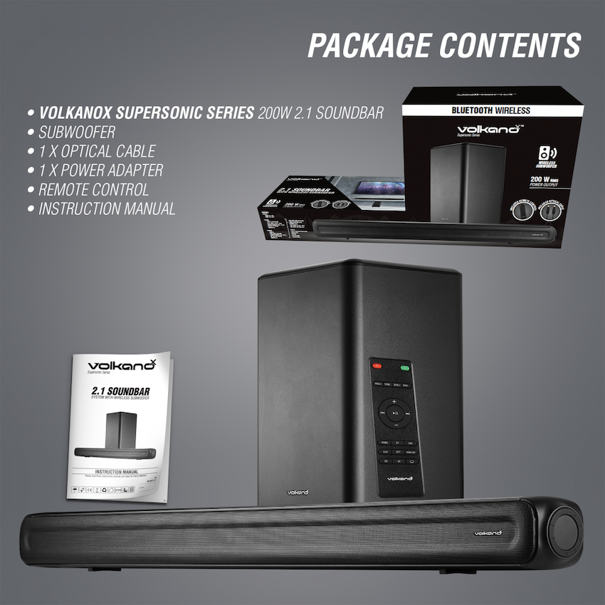 VolkanoX brings you the Supersonic Series 2.1 200 W Soundbar system.With a 200W RMS output and 2.1 Channel with up-firing drivers, this soundbar and subwoofer combo pack a punch. Perfect for the consumer who craves a real at-home cinema experience. The sub-woofer is wireless, meaning it does not need to be plugged directly into the soundbar itself in order to transmit audio. This allows you to plug the subwoofer into any plug point within your home within a 15m range. Control where your bass gets distributed from!The soundbar has additional inputs and features in order to simplify your life. These include:A USB input jackIncluded Optical CableRCA to Aux CableIncluded Remote ControlWhat’s in the box1 x VolkanoX Supersonic 2.1 200W Soundbar1 x VolkanoX Supersonic Subwoofer1 x Remote Control1 x Optical Cable1 x Instruction manual