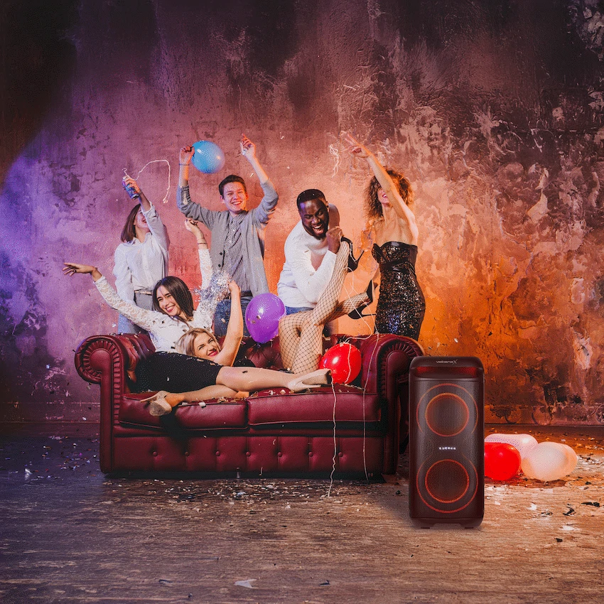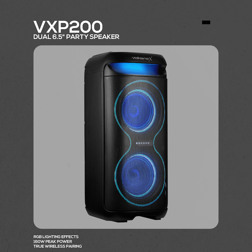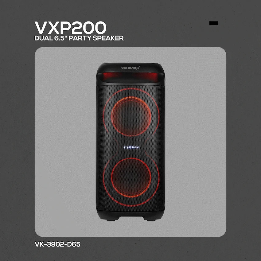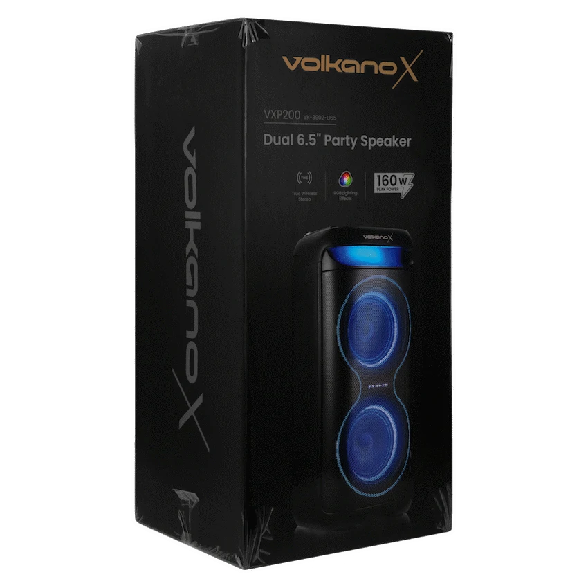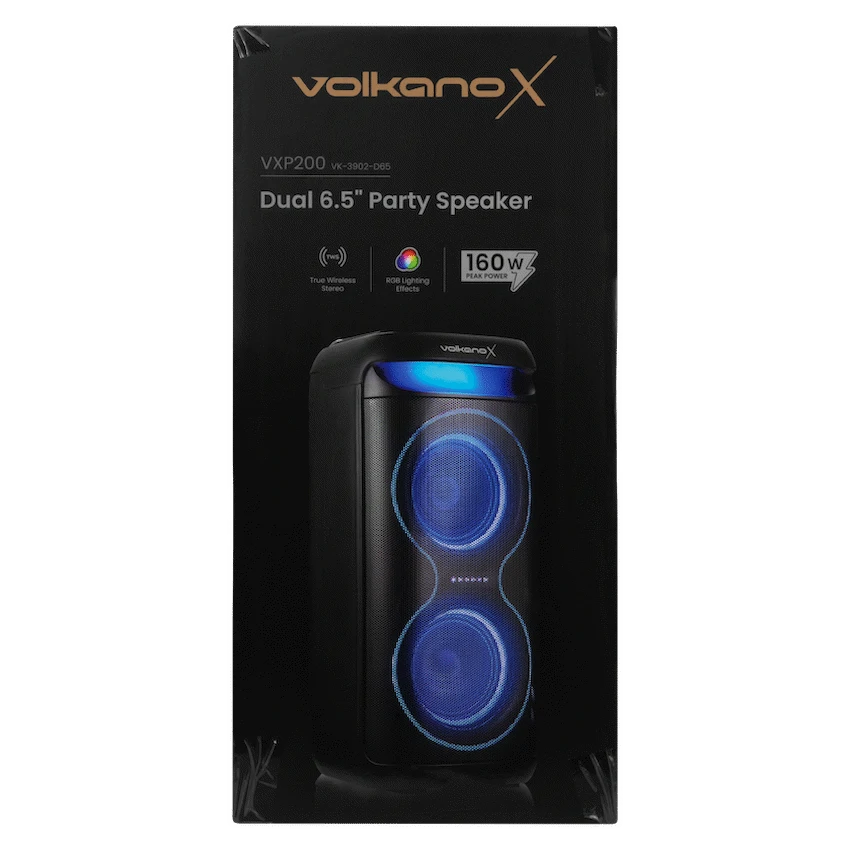 Turn up the energy with the VolkanoX VXP200 Dual 6.5″ Bluetooth Party Speaker. Designed for South African music lovers who want power, versatility, and portability, this speaker delivers 40W RMS (160W peak power) through dual 6.5″ woofers and a 1.5″ tweeter, ensuring booming bass and crisp highs.Whether it’s a house party, outdoor gathering, or karaoke night, the VXP200 is built to entertain. Enjoy True Wireless Stereo pairing (TWS) by linking two units for a massive stereo experience. The built-in mic input with echo and priority functions makes it perfect for karaoke, announcements, or MC events. Plus, with multiple playback options – Bluetooth, USB, SD card, Aux, and even song recording – your music never stops.The rechargeable 5400mAh battery delivers up to 8 hours of playtime, and a sturdy fixed carry handle makes it easy to move from one venue to another. Add to the party atmosphere with RGB lighting effects, while adjusting your sound to perfection with onboard bass and treble controls.