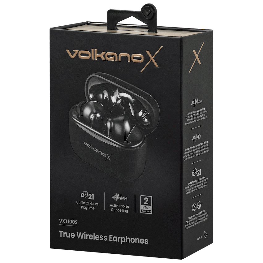 Experience powerful sound and focused listening with the VolkanoX VXT100S TWS Earphones. These premium TWS earphones with ANC are designed to block out distractions, letting you enjoy music, calls, and podcasts with crystal clarity-whether you’re commuting, working, or unwinding.Featuring advanced Active Noise Cancellation (ANC) and Environmental Noise Cancellation (ENC) powered by 4 built-in microphones, these VolkanoX ANC earphones ensure immersive audio and clear voice pickup even in noisy environments. With up to 21 hours of total playtime (including 2.5 case recharges), USB-C fast charging, and a lightweight fit, they’re built for all-day wireless freedom. The earphones also support voice assistants like Google and Siri, keeping your digital life at your fingertips.Feature HighlightsActive Noise Cancellation (ANC) – Block out external noise for immersive listeningClear Calls with 4 Mics + ENC – Advanced voice isolation for crystal-clear conversationsUp to 21 Hours Playtime – Long-lasting use with 2.5 case rechargesBluetooth 5.3 Connectivity – Reliable, fast pairing with your devicesGoogle and Siri Compatible – Access your voice assistant hands-freeTechnical SpecificationsBluetooth Version: 5.3Chipset: JLDriver Size: 10mmImpedance: 32?Sensitivity: 121 +/- 1.5dBBattery: 30mAh (Earbuds) / 200mAh (Charging Case)Charging Time: 1.5 HoursCharging Input: DC 5V, 500mACharging Port: USB-CNumber of Recharges: 2.5 TimesPlayback Time (50% Volume): 6 Hours (ANC Off), 4 Hours (ANC On)Playback Time (100% Volume): 5 Hours (ANC Off), 3 Hours (ANC On)What’s in the BoxVolkanoX VXT100S True Wireless EarphonesUSB-C Charging CableCharging CaseExtra EartipsInstruction ManualSilence the noise and amplify your audio experience with the VolkanoX VXT100S-engineered for clarity, comfort, and total wireless freedom.
